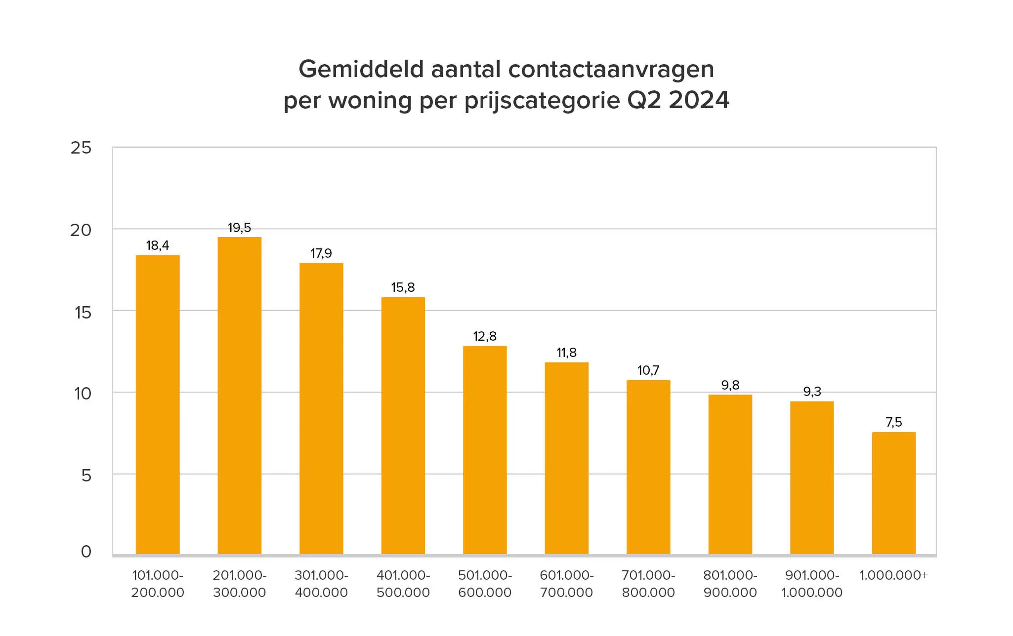 Qua prijscategorie zijn er ook duidelijke verschillen. Woningen tussen de 2 en 3 ton kregen de meest aanvragen, maar ook woningen vanaf 5 ton kregen gemiddeld meer aanvragen ten opzichte van vorig kwartaal.