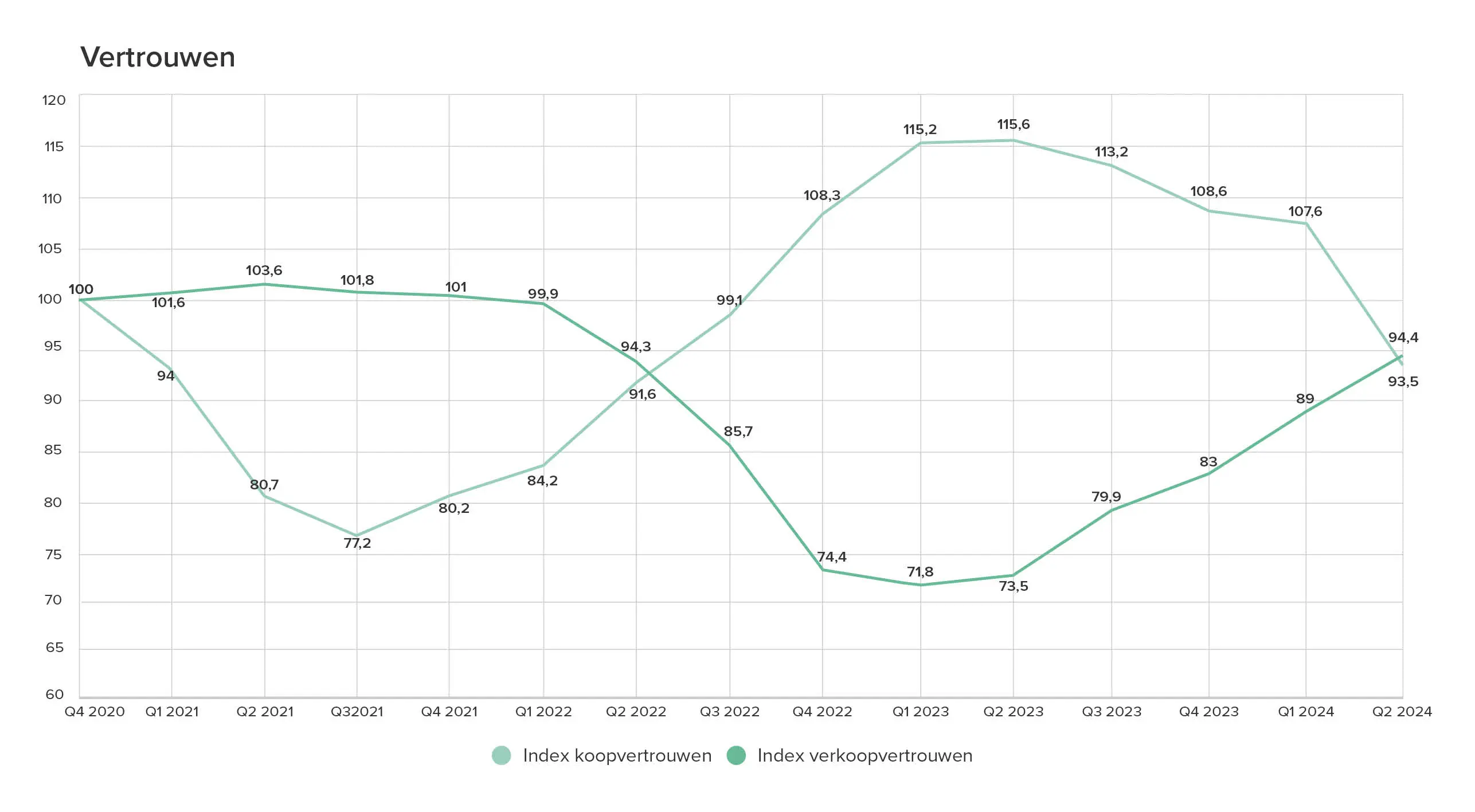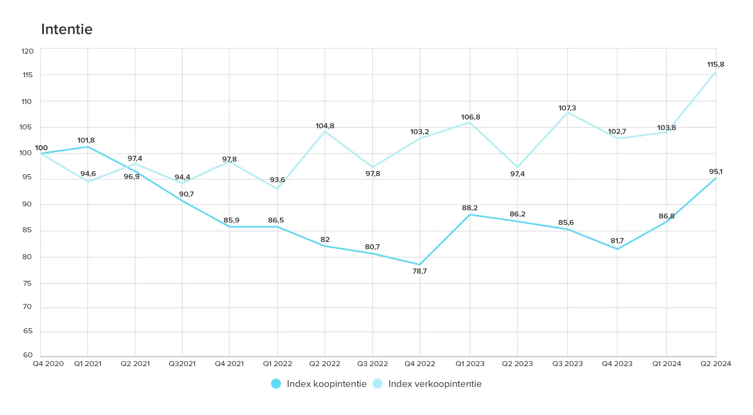 Respectievelijk stijgen koop- en verkoopintentie verder met 8 en 12 punten. Ten opzichte van hetzelfde kwartaal vorig jaar laten ze een stijging zien van 9 en 18 indexpunten.