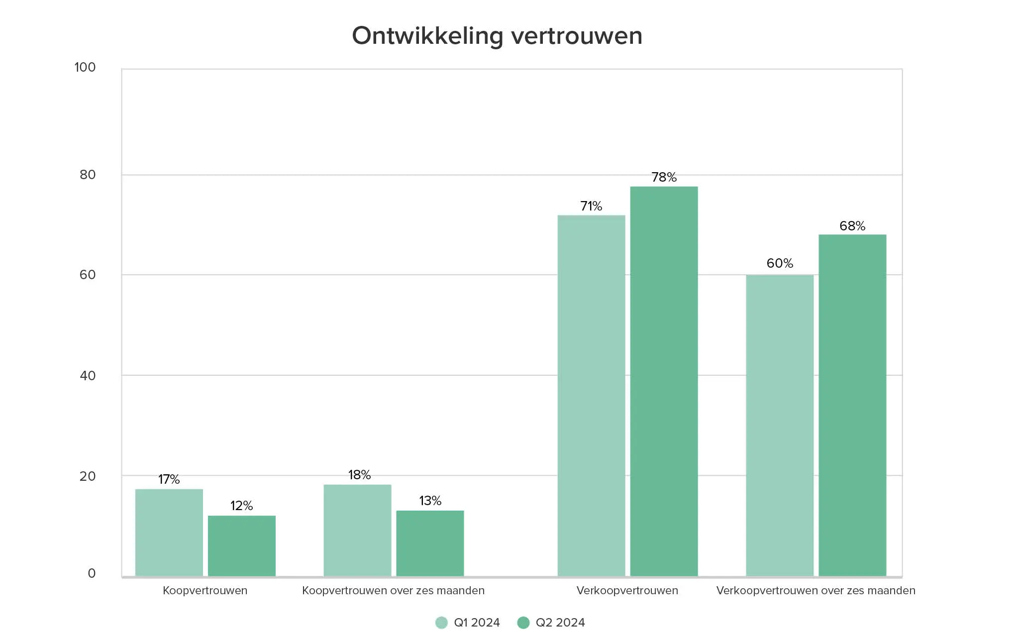 Het verkoopvertrouwen stijgt voor het vijfde kwartaal op rij. Dit keer met 5 punten ten opzichte van vorig kwartaal en maar liefst 21 punten als je het vergelijkt met vorig jaar. Dit houdt in dat 78% van alle respondenten de huidige markt als een goede markt ziet om te verkopen.