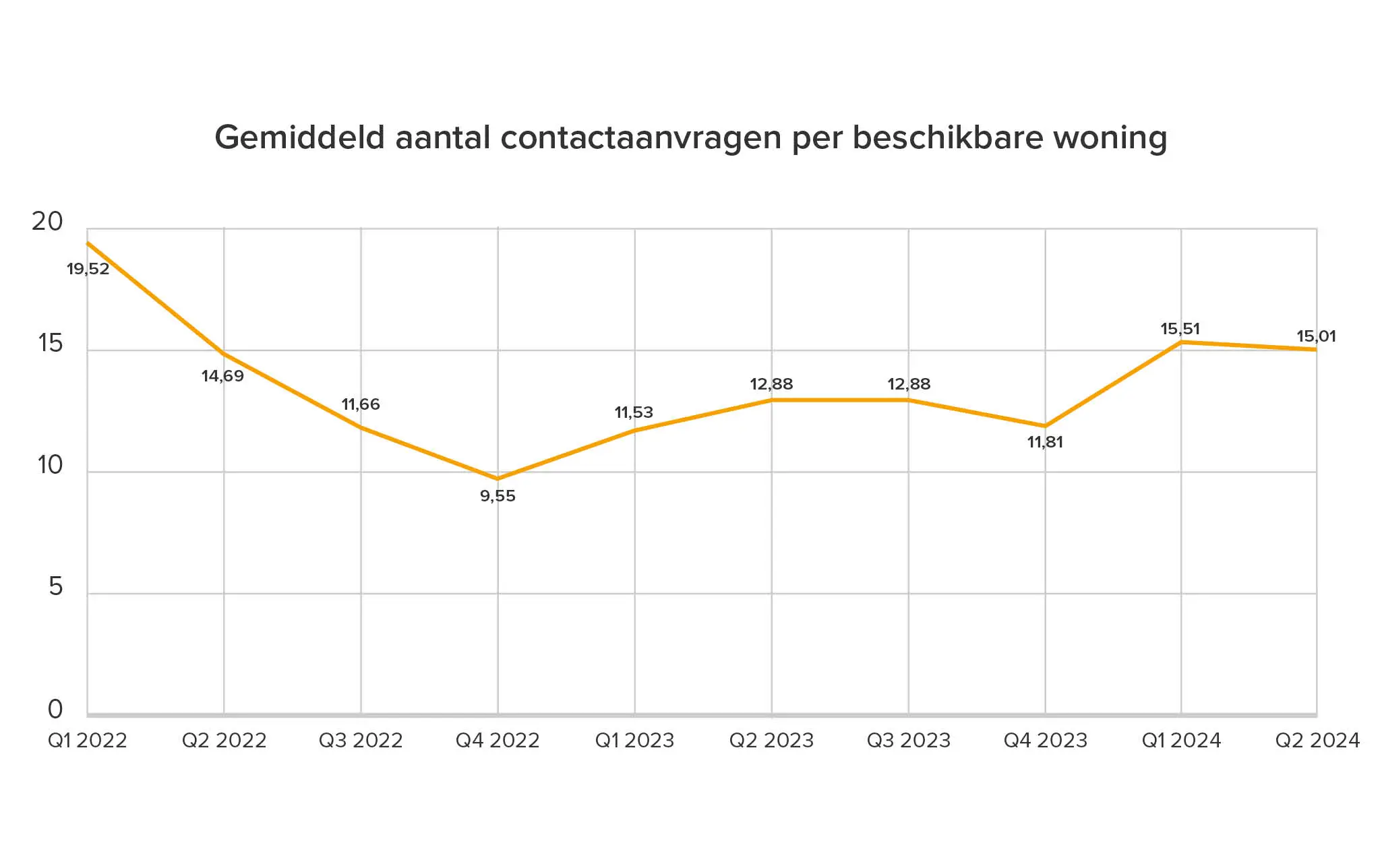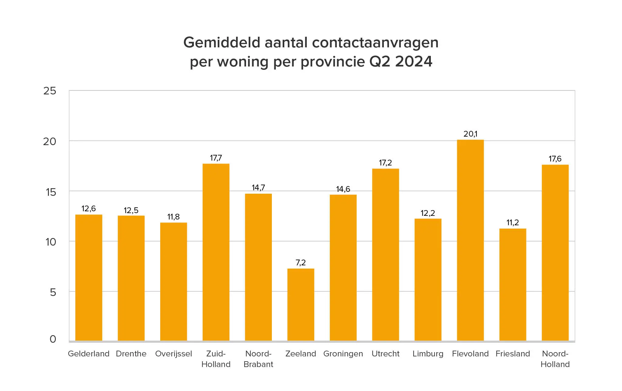 Wanneer we iets dieper ingaan op contactaanvragen, zien we dat woningen in Flevoland gemiddeld de meeste contactaanvragen kregen, gevolgd door Zuid-Holland, Noord-Holland en Utrecht. Zeeland was met gemiddeld 7,2 aanvragen het minst populair.