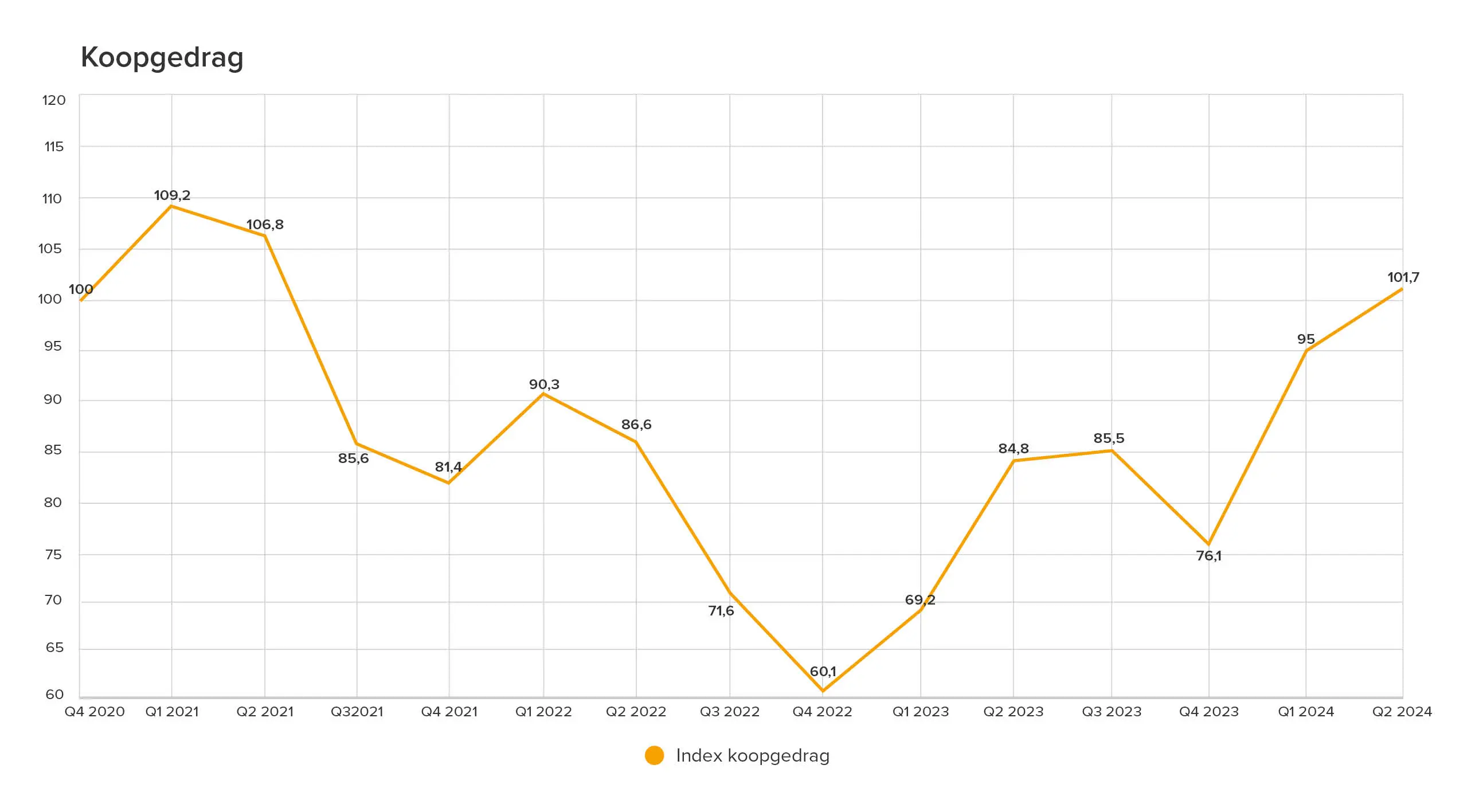 Het koopgedrag steeg in het tweede kwartaal met 6,6 indexpunten, en ten opzichte van vorig jaar met maar liefst 17 indexpunten. Dit kan te maken hebben met het feit dat er in het tweede kwartaal meer beschikbare woningen op funda geplaatst zijn. Verder blijkt uit de data dat er per beschikbare woning ongeveer evenveel contactverzoeken geplaatst worden.