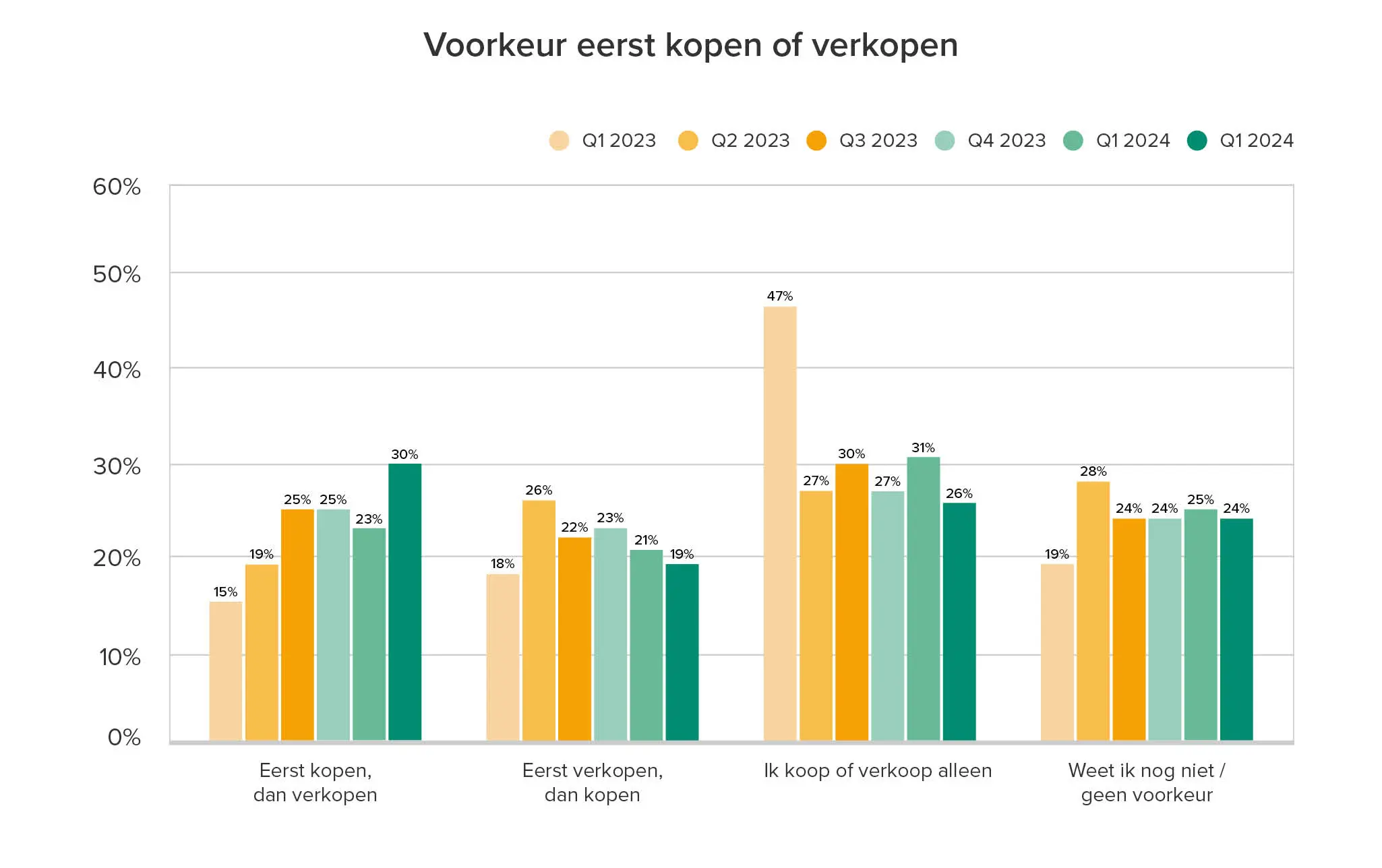 De wens om eerst te kopen en daarna pas te verkopen is duidelijker zichtbaar dan afgelopen kwartalen. Aangezien het lastig kan zijn om een nieuwe woning te vinden is dit een begrijpelijke tendens.