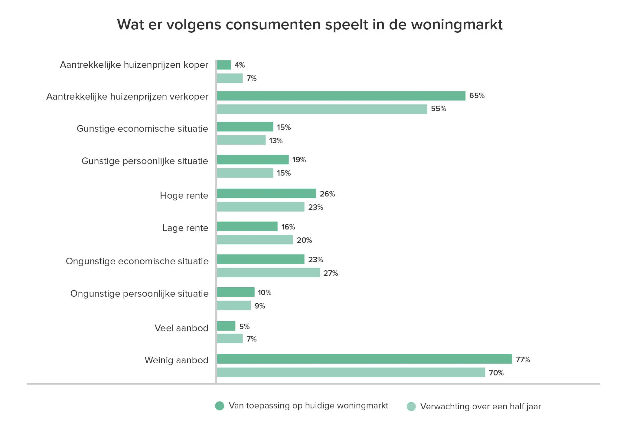 Consumenten geven aan dat er in de huidige woningmarkt met name sprake is van een klein passend aanbod, en aantrekkelijke huizenprijzen voor de verkoper. Dit is een vergelijkbaar beeld met vorig kwartaal.