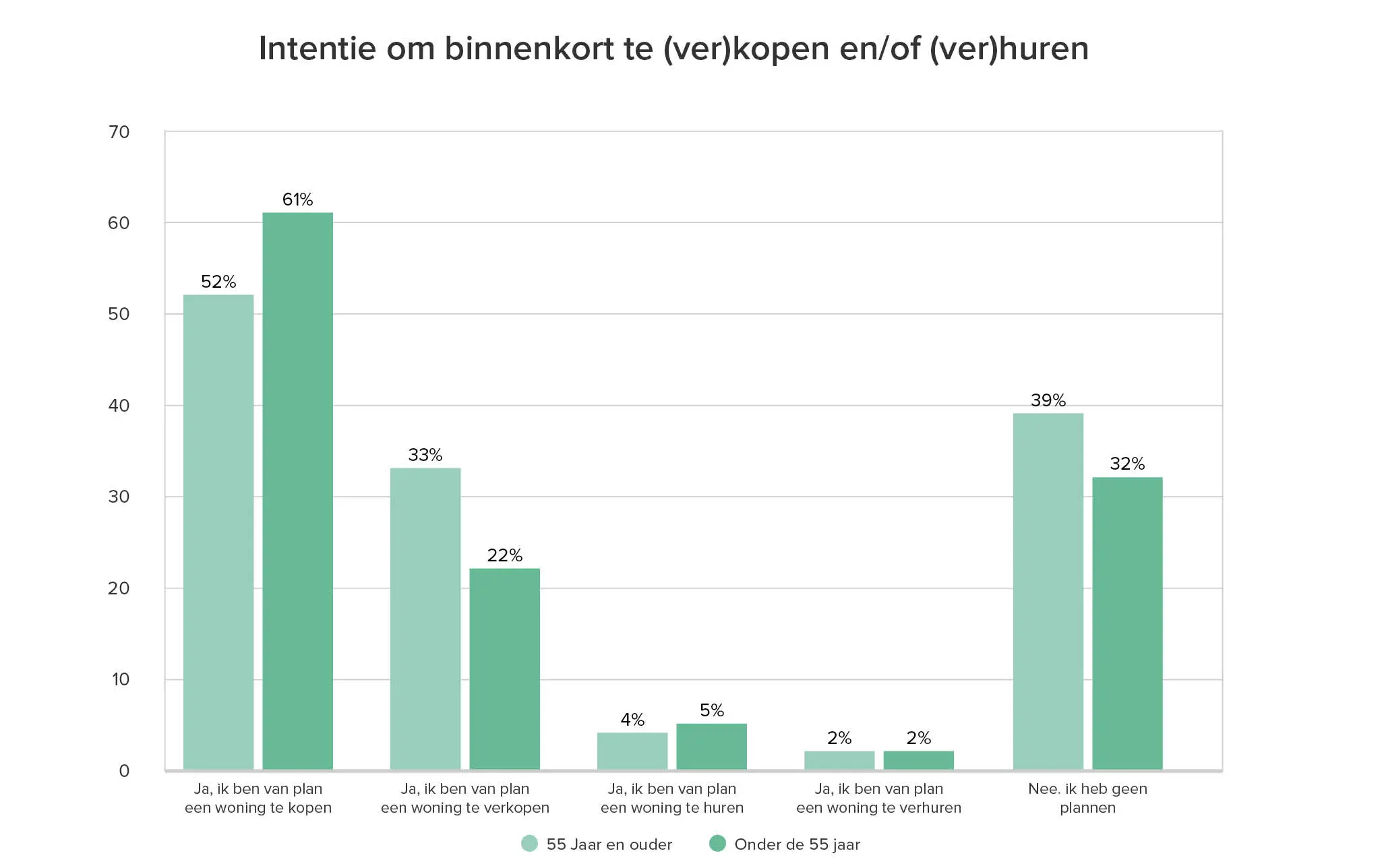 Meer dan de helft van de 55-plussers wil graag binnenkort een nieuwe woning kopen. Van de 55-plussers die aangeven dit binnenkort niet te willen doen (39%), geeft 52% aan dit ooit wél nog van plan te zijn. Een groot gedeelte van 55-plussers ziet zichzelf dus binnenkort of later nog verhuizen. De 55-plussers die liever niet meer verhuizen geven aan dat ze momenteel fijn wonen, en gehecht zijn aan hun huidige woning en omgeving.