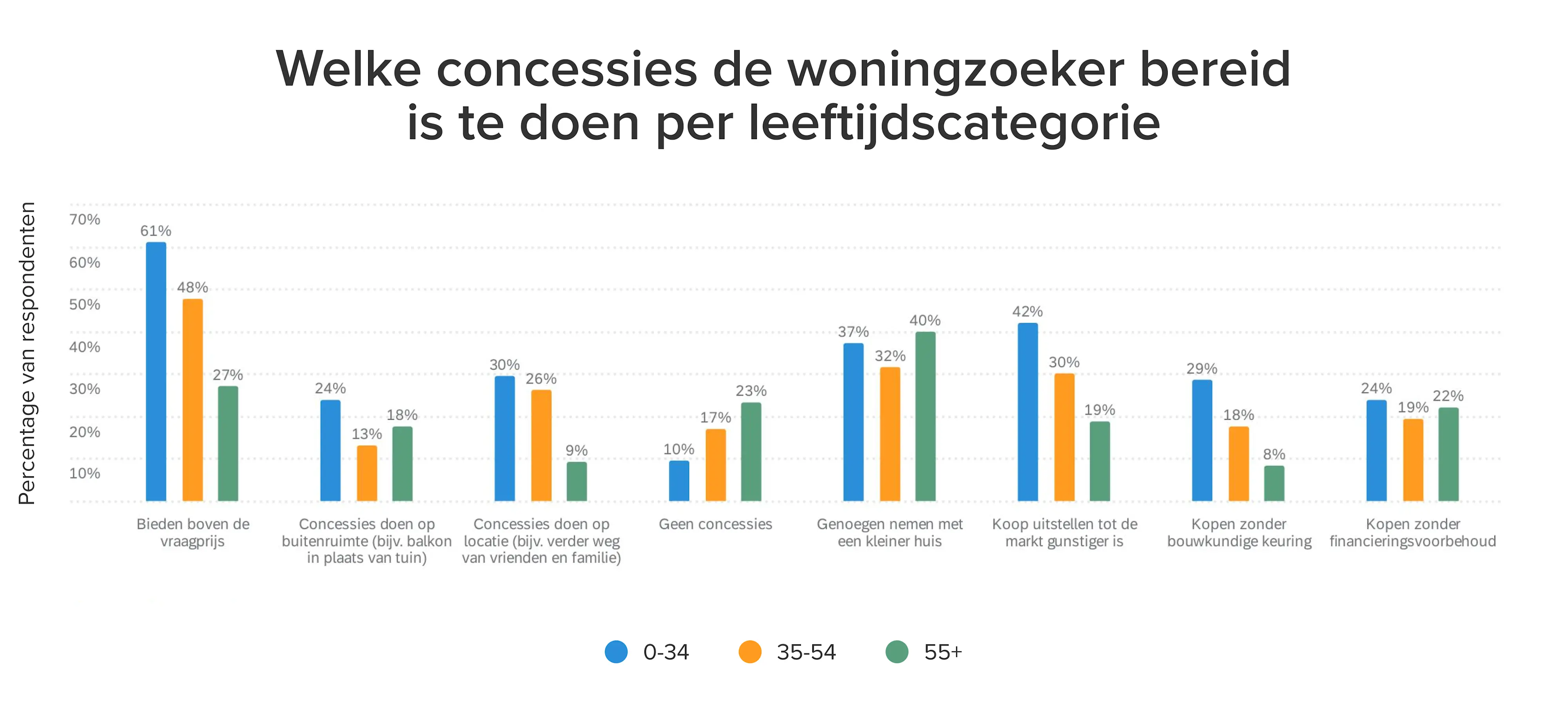 De leeftijdscategorieën tot 55 jaar noemen overbieden het vaakst als concessie. De categorie 55-plus geeft het vaakst aan genoegen te nemen met een kleiner huis; 40% van hen is bereid kleiner te gaan wonen. Wat ook opvalt, is dat 23% van alle 55-plus-respondenten helemaal geen concessies wil doen, beduidend meer dan de jongere leeftijdscategorieën (10% en 17%).
