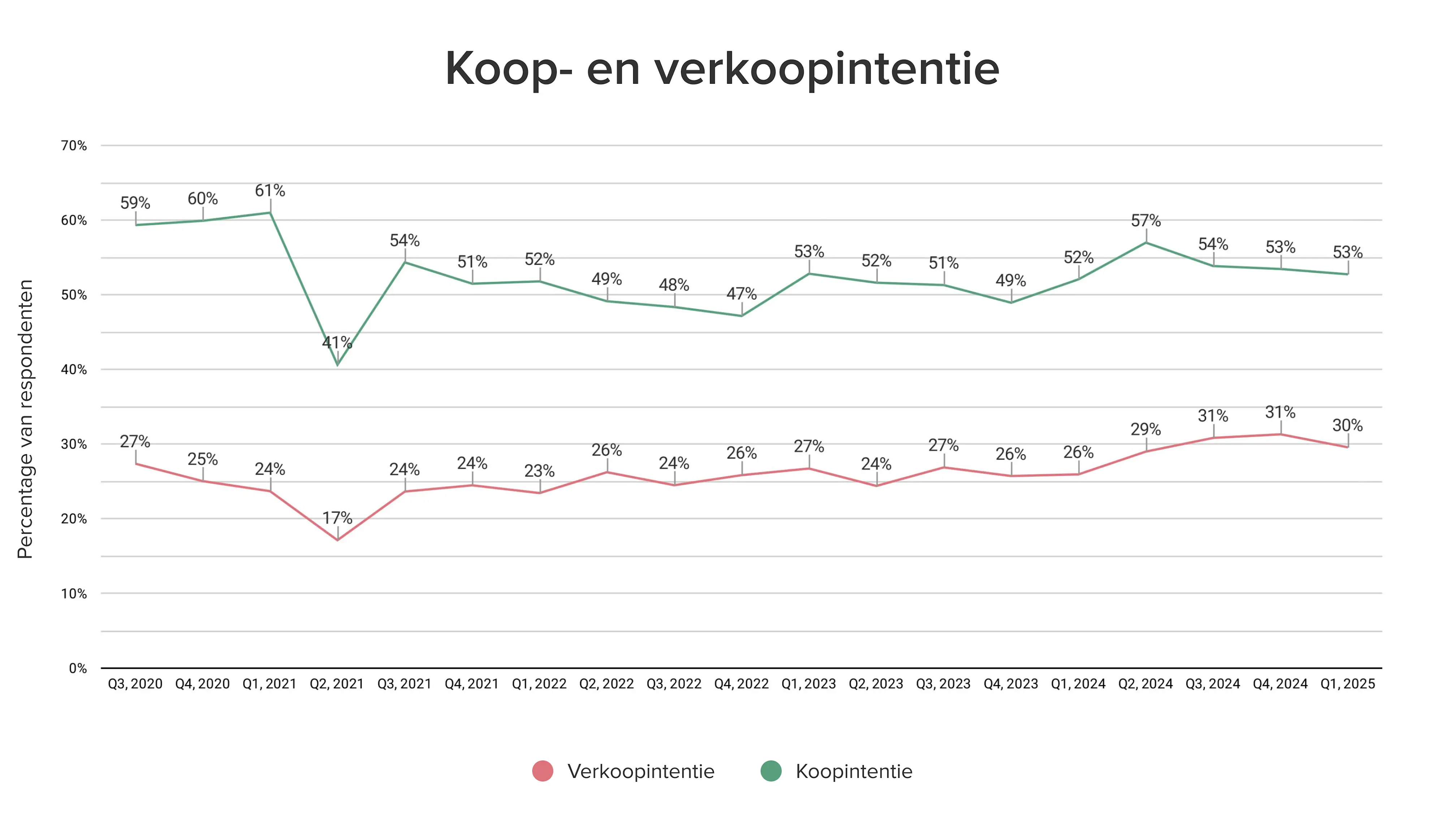 De koop- en verkoopintentie blijven al sinds eind 2021 redelijk stabiel. In vergelijking met hetzelfde kwartaal vorig jaar ligt de verkoopintentie 4% hoger en de koopintentie slechts 1% hoger.