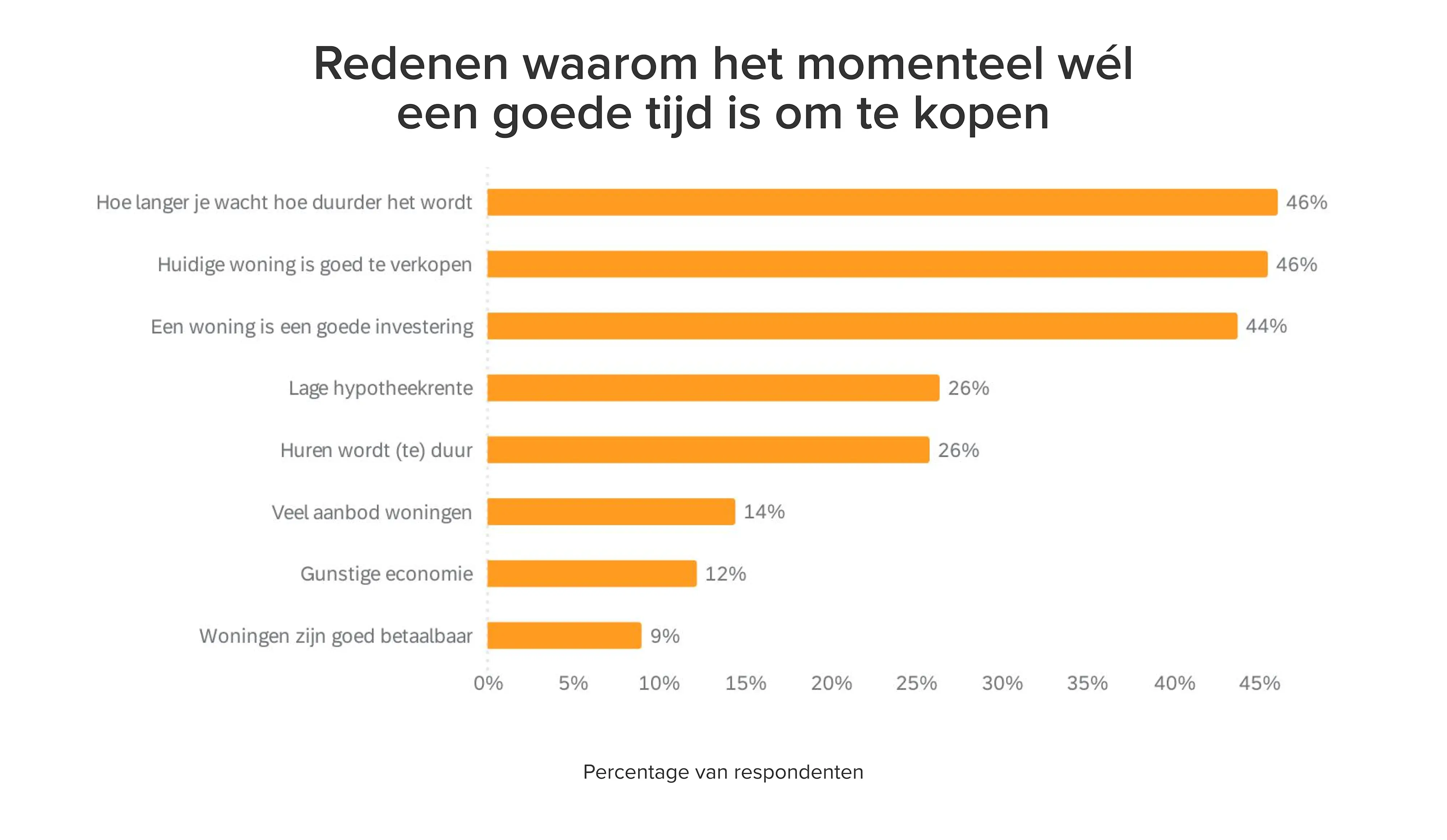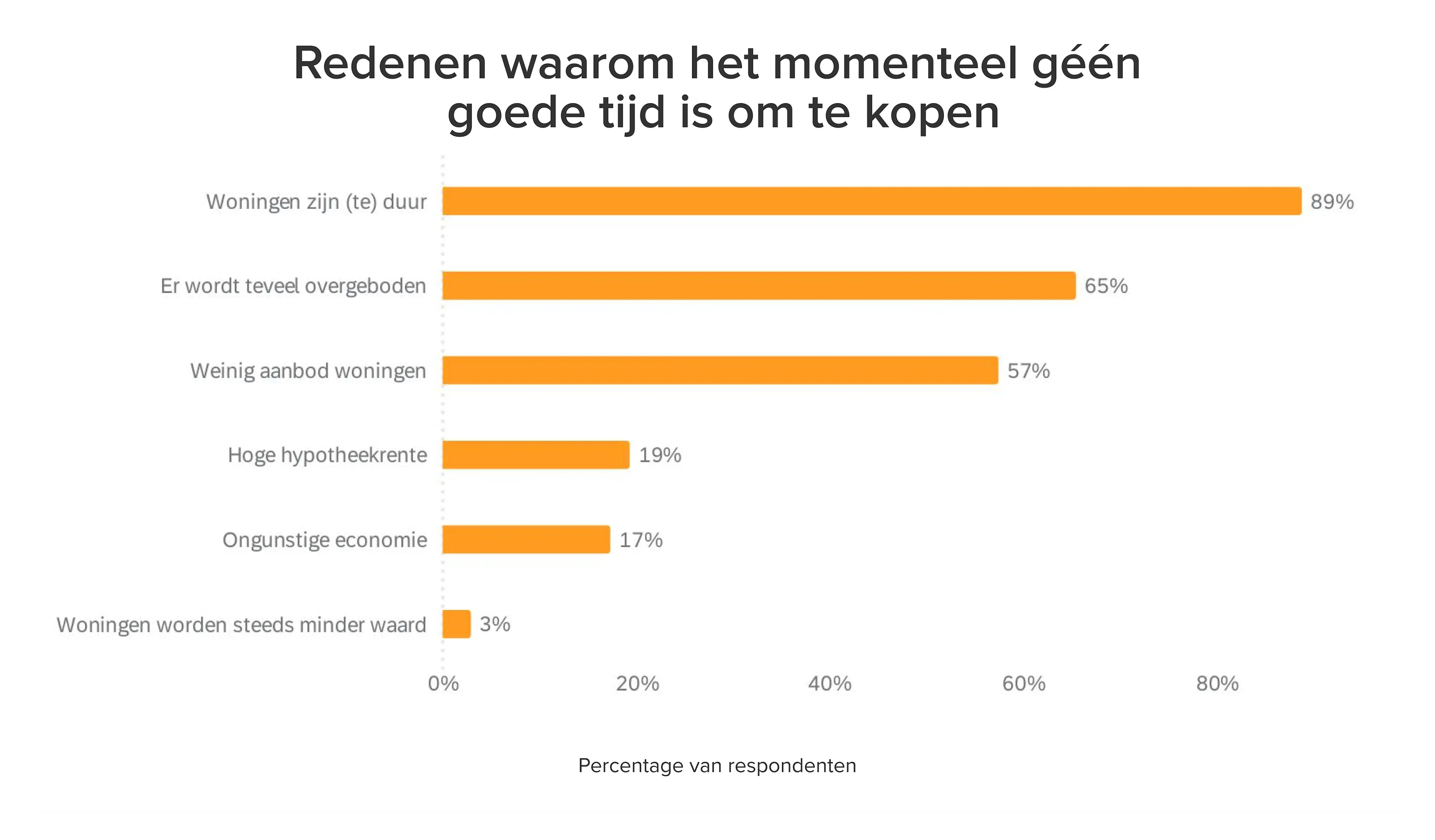 Volgens de respondenten zijn hoge huizenprijzen, het vele overbieden en het lage aanbod de belangrijkste redenen waarom het nu geen goed moment is om te kopen. Tegelijkertijd verwachten zij dat huizen alleen maar duurder worden, wat dan weer wél een reden is om nu iets te kopen.