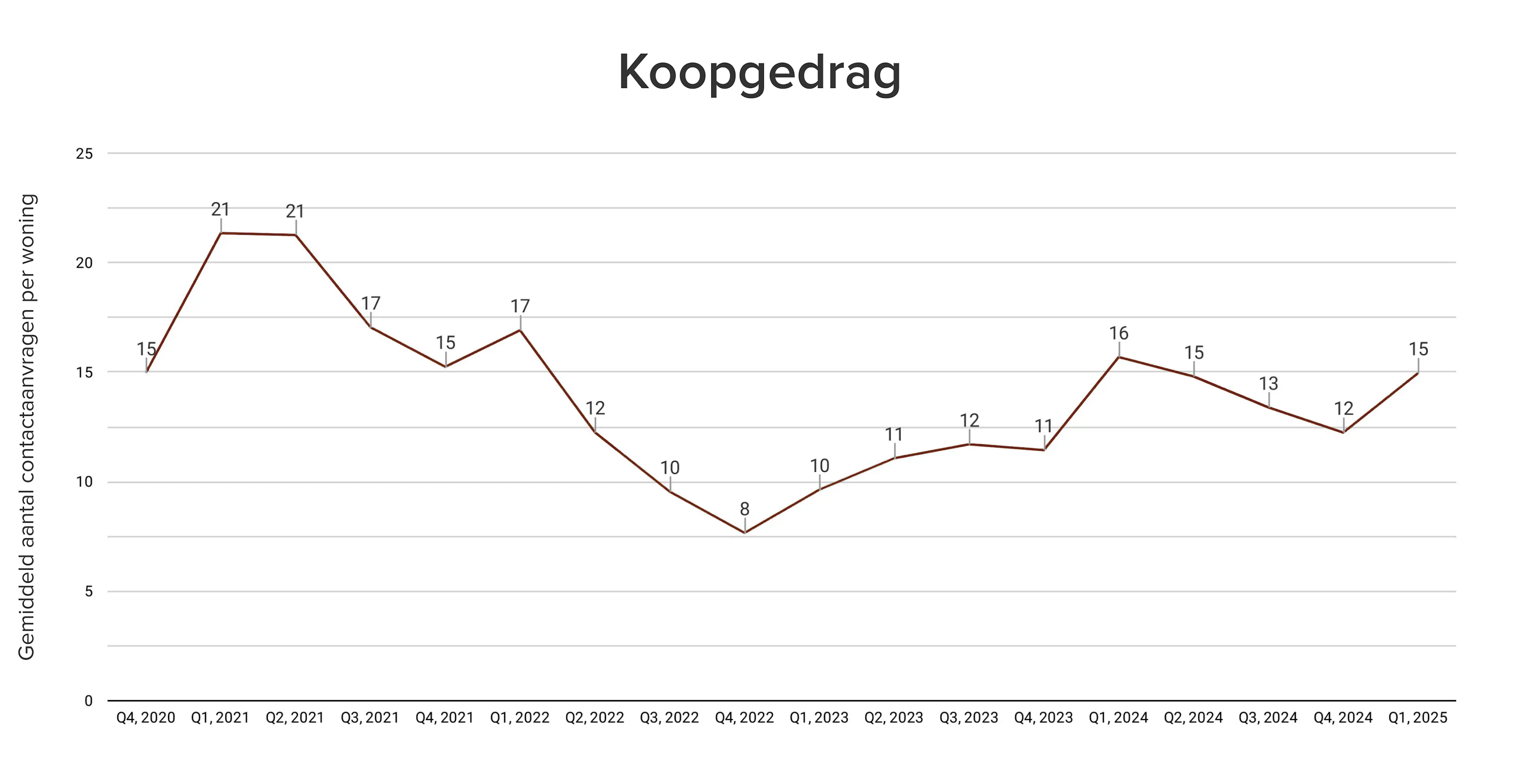 Dit kwartaal is er weer een stijging te zien in het gemiddeld aantal contactaanvragen per woning. Het aantal aanvragen via Funda stijgt van 12 in het vierde kwartaal van 2024 naar 15. Kijken we echter naar het eerste kwartaal vorig jaar, dan zien we een daling van 1 aanvraag per woning.