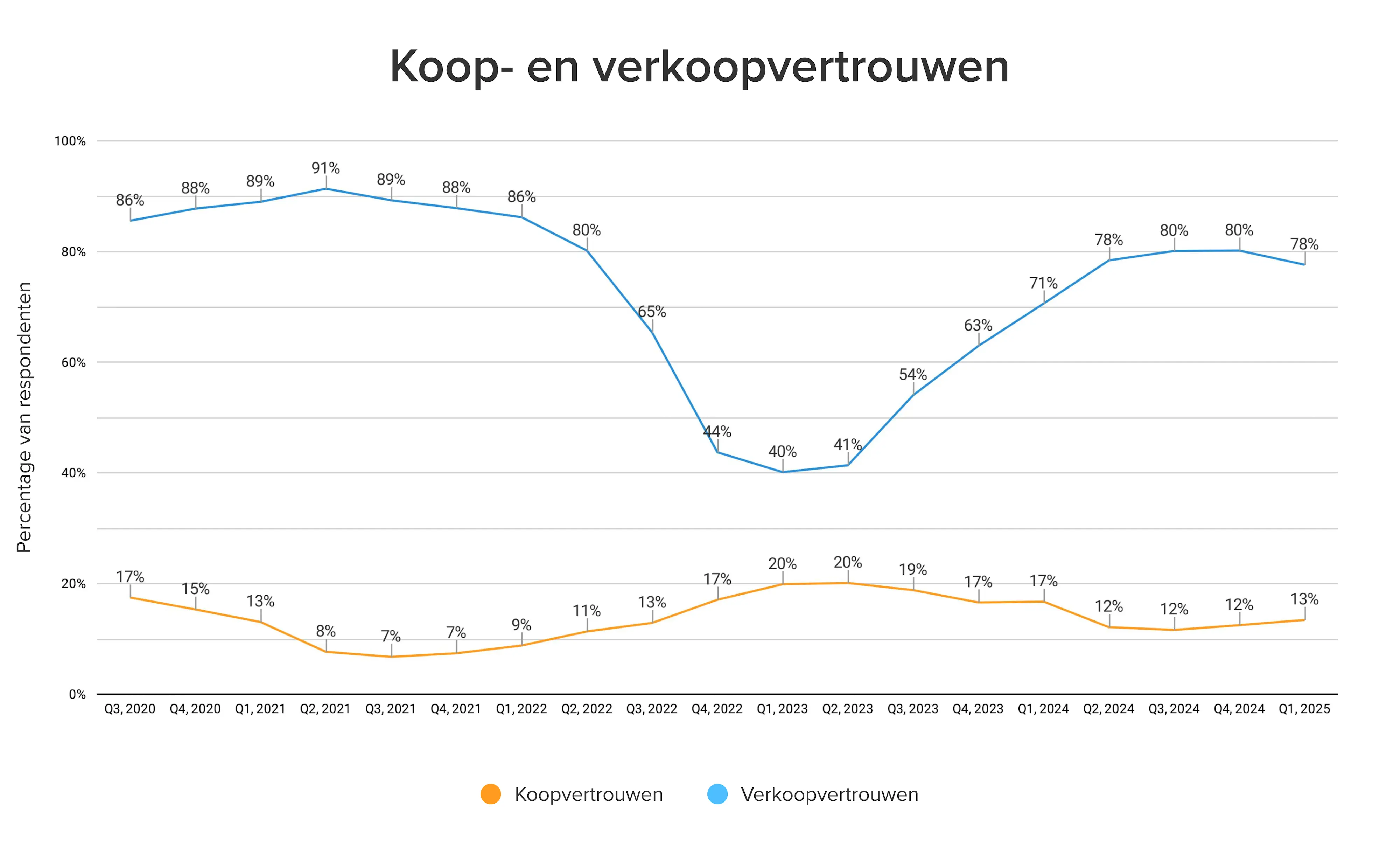 De cijfers over het eerste kwartaal van 2025 laten een nagenoeg ongewijzigd beeld zien. Het verkoopvertrouwen blijft hoog, al laat het een kleine daling zien van 2% in het eerste kwartaal van 2025. Het koopvertrouwen is wel iets toegenomen ten opzichte van het vorige kwartaal, hoewel slechts met één procentpunt.