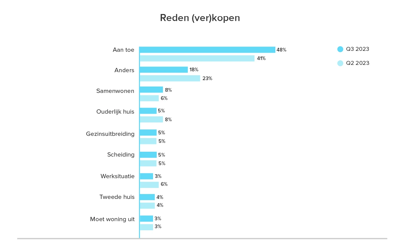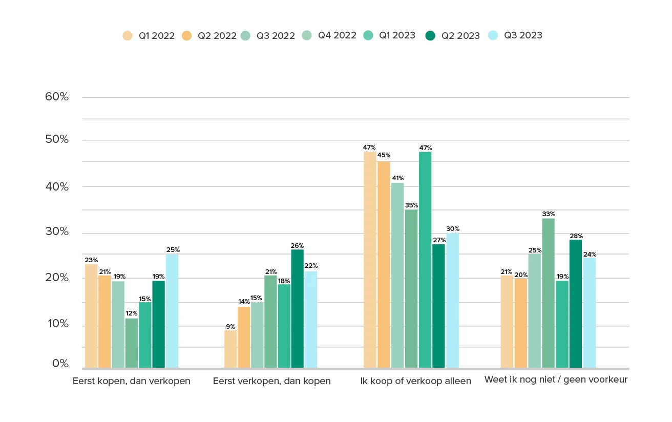 In het derde kwartaal van 2023 zien we dat de groep die eerst wil verkopen en dan wil kopen toeneemt naar 25%. De groep die eerst wil verkopen neemt af naar 22%.