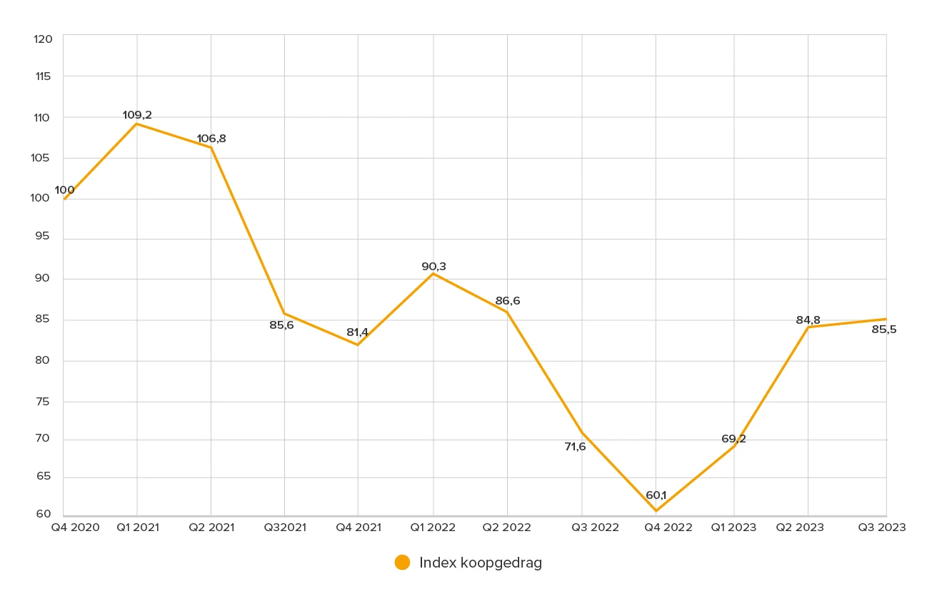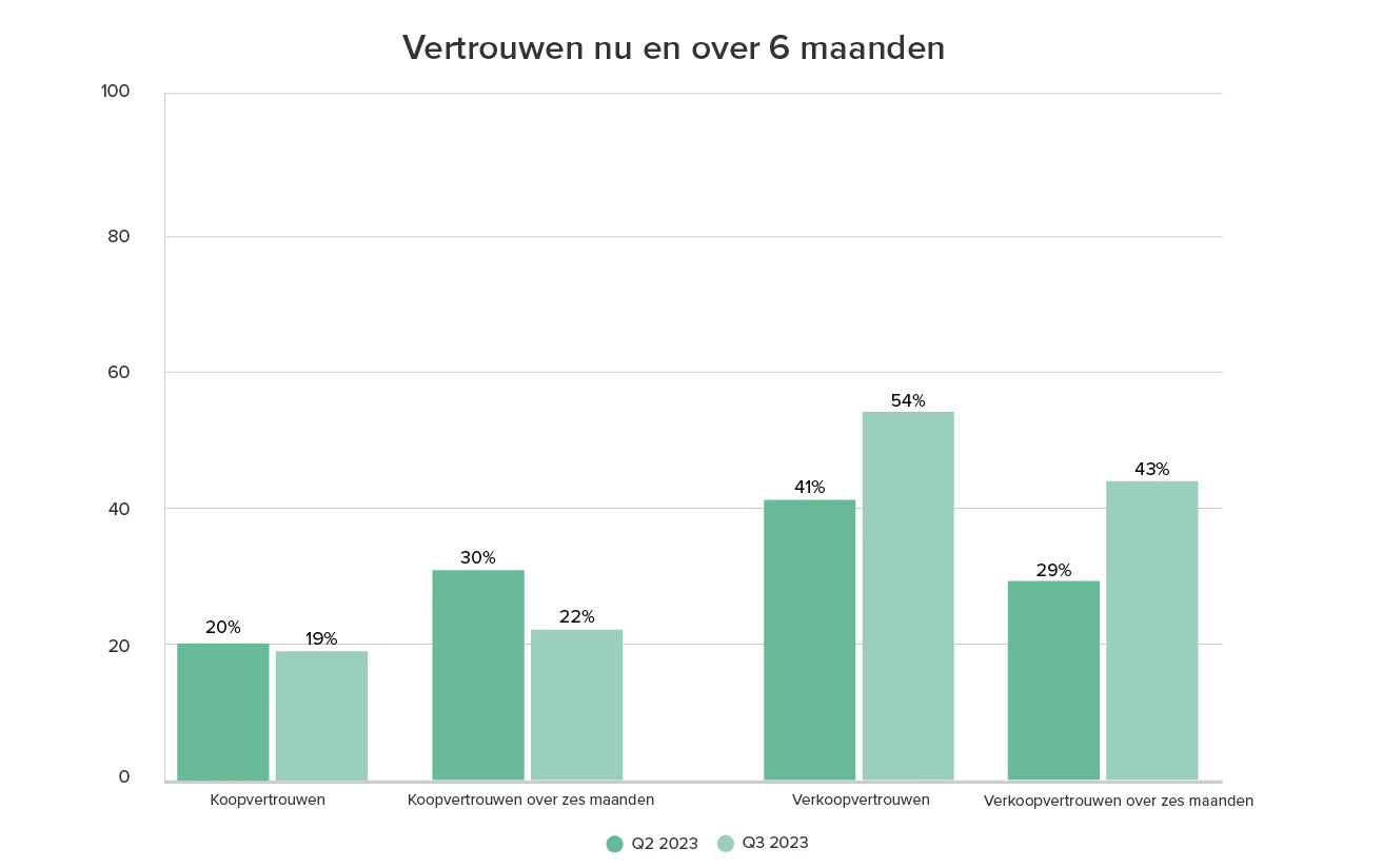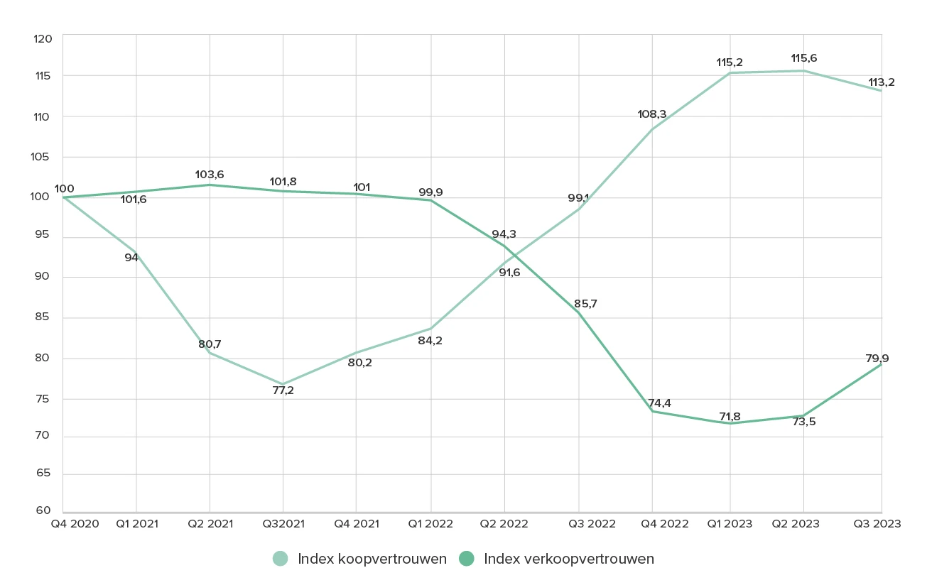 Na een stijging van 7 kwartalen, daalt het koopvertrouwen met 2,4 procentpunt naar 113,2. Dit kwartaal vindt 19% van de consumenten de markt gunstig voor koop. Het verkoopvertrouwen neemt flink toe met 6,4 procentpunt. Dit kwartaal vindt 54% van de consumenten dat de huidige markt een goed moment is om te verkopen. Dit ligt nog wel ver onder hetzelfde kwartaal in 2022, toen vond 65% van de consumenten het een goed moment om te verkopen.