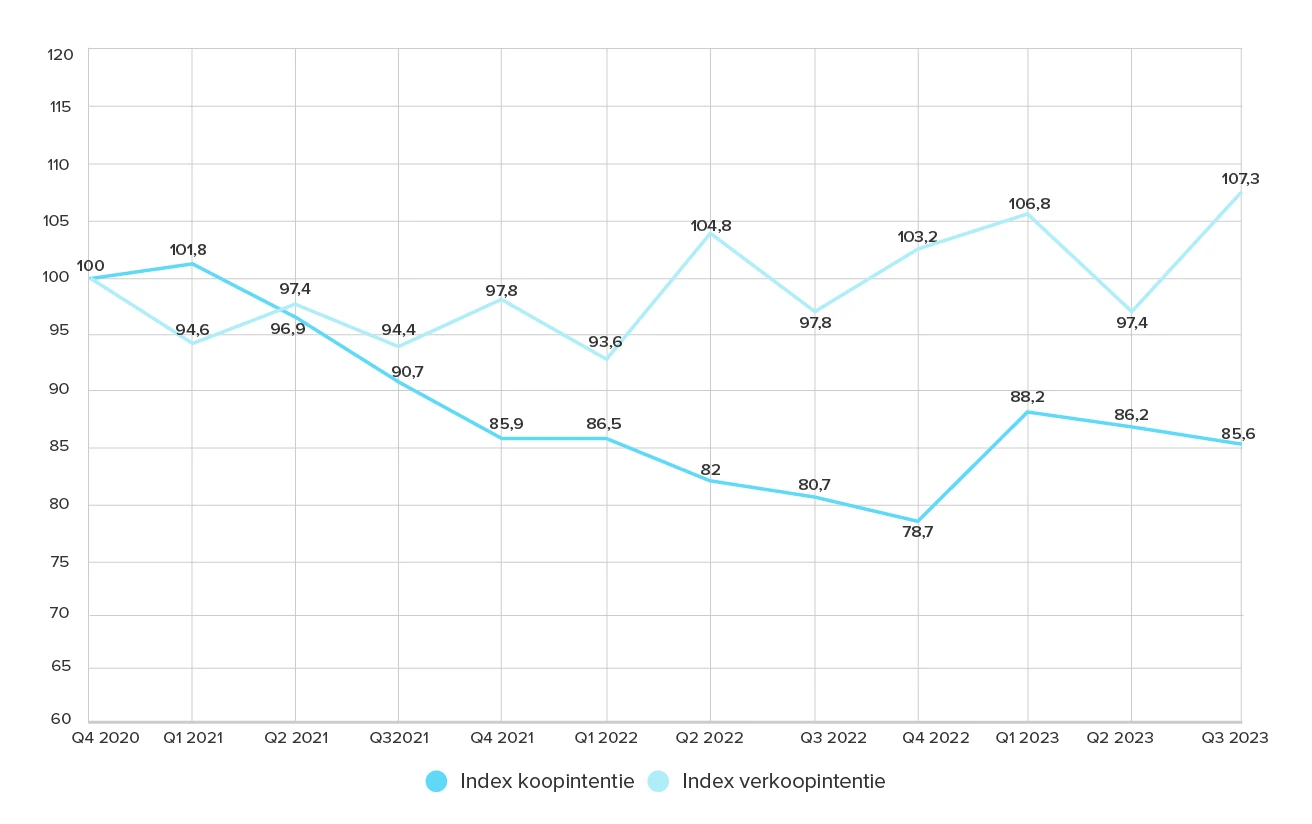 De daling van afgelopen kwartaal in verkoopintentie zet niet door. De intentie om binnen nu en drie maanden een huis te kopen stijgt dit kwartaal flink met 9,9 procentpunt. De intentie om binnen nu en drie maanden een huis te kopen is redelijk stabiel met 0,6 punt ten opzichte van vorig kwartaal, en ligt 4,9 procentpunt hoger dan het derde kwartaal van 2022.