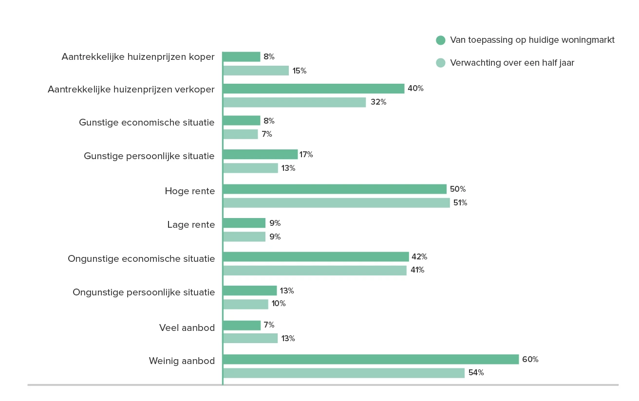 De huidige woningmarkt wordt volgens consumenten beïnvloed door de hoge rente (50%), weinig aanbod van woningen (60%) en een ongunstige economische situatie (42%). Een jaar geleden werd het sentiment op de woningmarkt met name gedomineerd door het geringe aanbod en de lage rente. Vooruitkijkend verwacht men dat dezelfde factoren een rol blijven spelen. Er werd eerder verwacht dat huizenprijzen flink aantrekkelijker zouden worden in de toekomst, maar die verwachting neemt af (nu nog maar 15%).