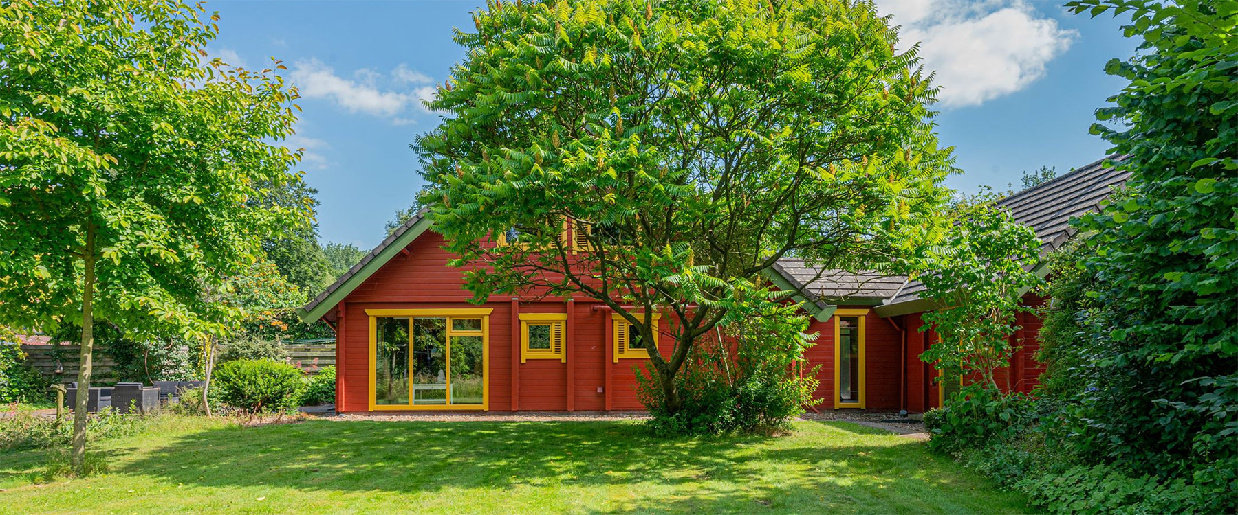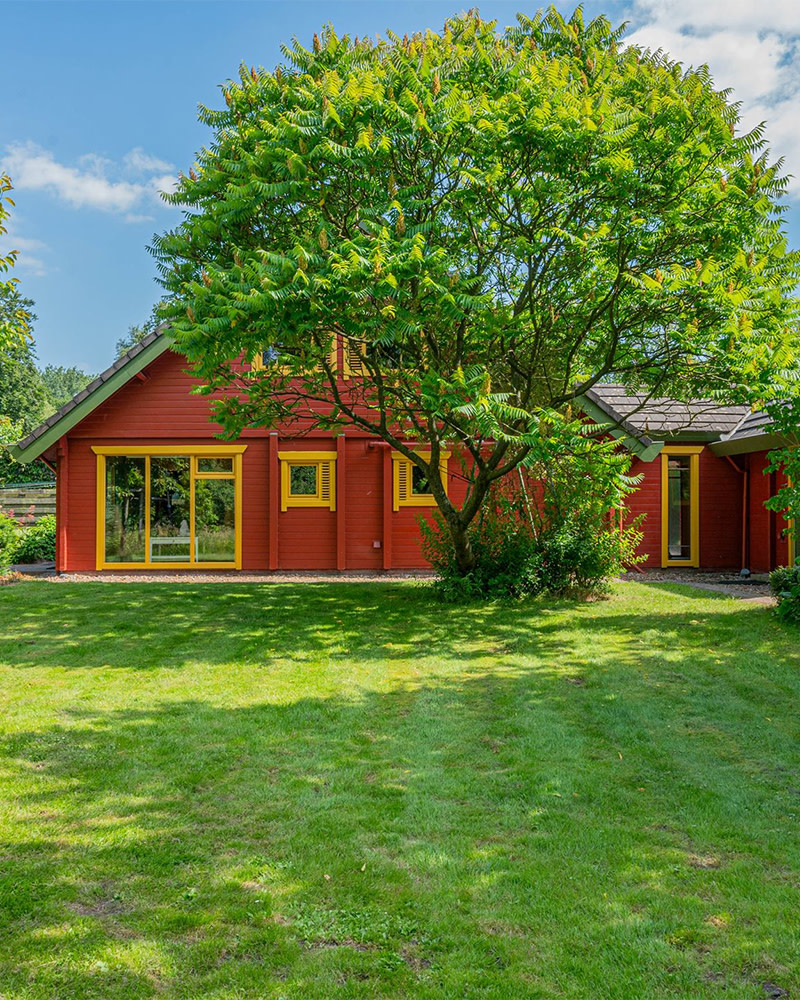 Droom je van een Pippi Langkous-achtig huis in Scandinavische stijl? Dit is je kans. Dit sprookjesachtige vrijstaande huis, omringd door natuur, heeft een gevel volledig gemaakt van rode en gele planken. En daar krijg je nog een prachtige tuin met zitjes, een tuinhuis én een bos bij.