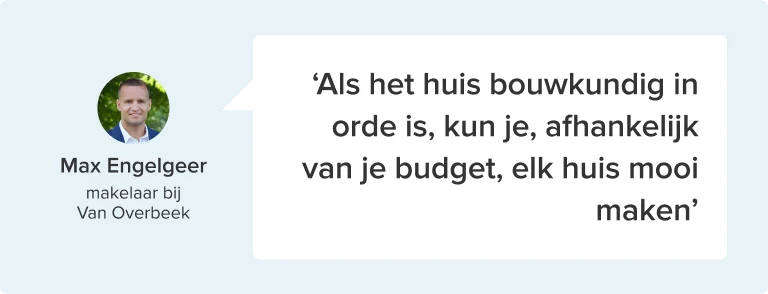 ‘Als het huis bouwkundig in orde is, kun je, afhankelijk van je budget, elk huis mooi maken’ zegt Engelgeer. ‘Je wil vooral geen gedoe krijgen met achterstallig onderhoud, zoals lekkages.’