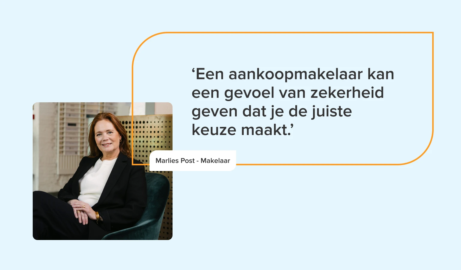 Plan vrijblijvend een kennismakingsgesprek in met een aantal aankoopmakelaars in je buurt. Op die manier kun je goed hun diensten en werkwijze vergelijken en ontdekken met wie je de grootste klik hebt.