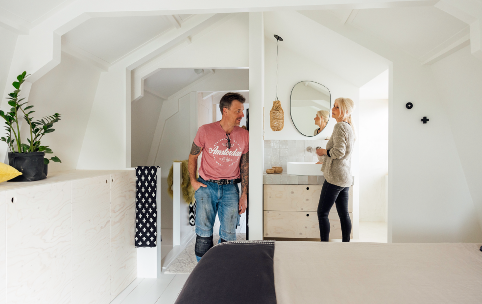 Hun huis in Sint Pancras verkochten ze binnen een mum van tijd. In vier weken tijd verbouwde Jeffrey in hun nieuwe stek de bovenverdieping. Hij maakte twee slaapkamers, stucte alle muren en bouwde hun droombadkamer.