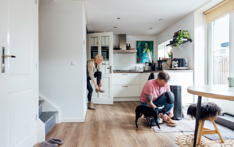 Sonja: ‘Iedereen die hier binnenkomt, zegt: zó, dat is klein. Nu heeft de keuken nog ongeveer anderhalf keukenkastje, maar binnenkort gaan we uitbouwen en komt daarbovenop een extra slaapkamer. Maar het allergrootste voordeel is dat onze maandelijkse kosten enorm omlaag zijn gegaan. We leven zo goed als hypotheekvrij.’