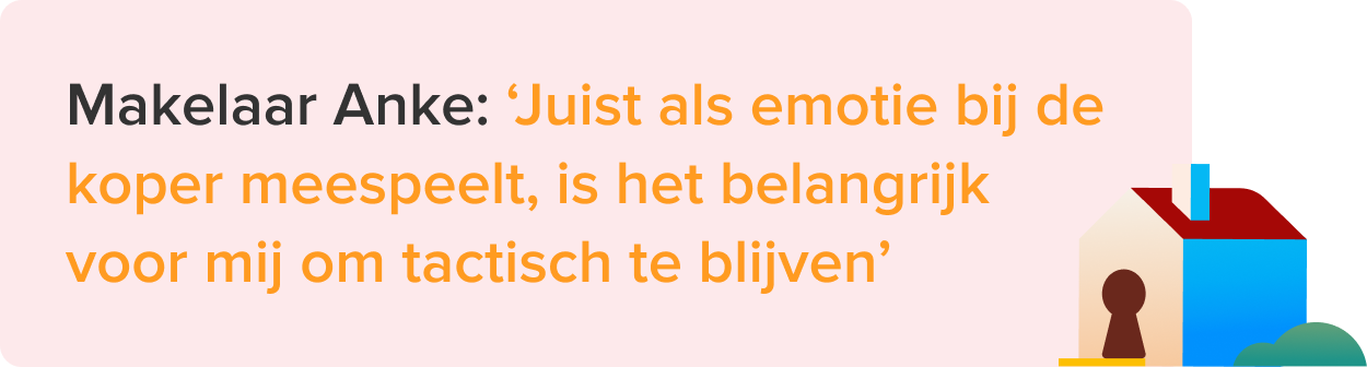 ‘Het hele huis ademde creativiteit,’ zegt Eloe. ‘We waren meteen onder de indruk van de lichtinval. We vielen er als een blok voor.’ Toch blijft makelaar Anke scherp. ‘De vraagprijs was stevig dus dit moesten we zorgvuldig en slim aanpakken. Als aankoopmakelaar kijk je niet met je hart, maar met je hoofd,’ zegt ze. ‘Juist als emotie bij de koper meespeelt, is het belangrijk voor mij om tactisch te blijven.’ Anke kijkt kritisch naar het aantal vierkante meters en adviseert op basis daarvan een goed onderbouwd, realistisch tegenbod. En het werkt. Eloe: ‘Anke hield het hoofd koel en bracht rust in de onderhandeling. Dankzij haar kwam ons droomhuis binnen handbereik.’