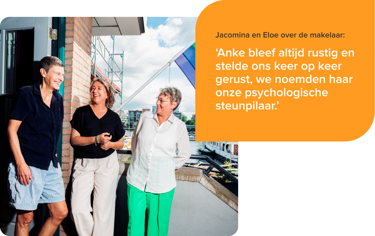 ‘Inmiddels kwam de deadline voor het bieden op het nieuwe huis steeds dichterbij. Uiteindelijk gaven we, vanaf een bergtop tijdens onze vakantie, Anke het groene licht. Daarmee brachten we officieel ons bod uit,’ vertelt Eloe. ‘Niet veel later kwam het verlossende telefoontje: het bod was geaccepteerd! Maar écht opgelucht waren we nog niet, want ons oude huis moest nog verkocht worden. Dat duurde langer dan verwacht en dat was enorm spannend.’ Jacomina lacht: ‘Soms leek het alsof we wel duizend doden stierven. Maar Anke bleef altijd rustig en stelde ons keer op keer gerust. We noemden haar dan ook onze psychologische steunpilaar. Uiteindelijk wist ze gelukkig ons huis binnen twee maanden te verkopen.’