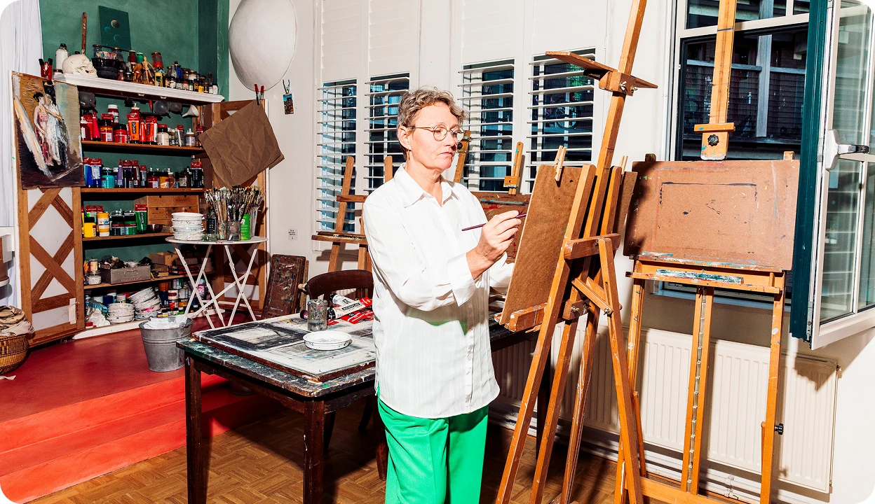 Wonder boven wonder komt er al vrij snel een huis voorbij dat precies bij hen past. In Amsterdam, met een buitenruimte en met een atelier voor Jacomina’s schilderlessen. Deze woning werd eerder bewoond door een Amsterdamse kunstenaar en daarna door een bekende Nederlandse zanger. Een plek met een artistiek verleden. Het lijkt te mooi om waar te zijn. ‘Eigenlijk was het huis te duur,’ vertelt Anke. ‘Maar het leek speciaal voor deze twee kleurrijke dames gebouwd. Dus we moesten het proberen. Ik belde de verkopend makelaar om te vertellen waarom ik het perfecte stel had voor dit unieke huis. Hij had al veel bezichtigingsaanvragen, maar mijn telefoontje wierp toch z’n vruchten af. We mochten komen kijken.’