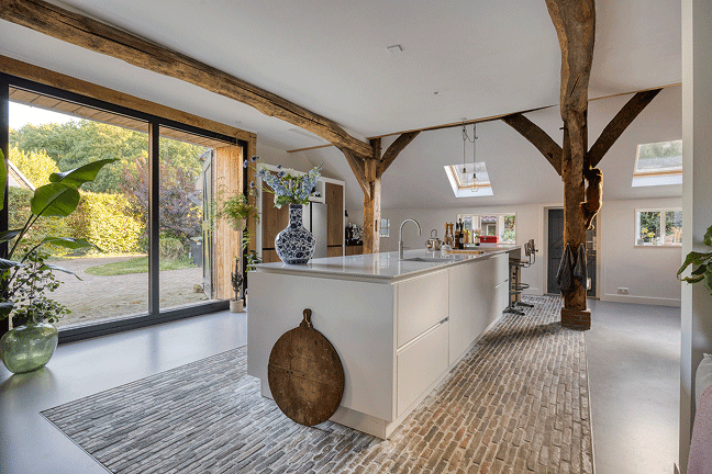 Een trend die steeds zichtbaarder wordt, is materialen van buiten doortrekken naar binnen. ‘Hout, natuursteen of betonlook vloeren lopen visueel door van de tuin in de keuken. Dat geeft een ruimtelijk en harmonieus gevoel. De keuken is hierdoor niet langer een afgesloten werkplek, maar wordt steeds meer een leefruimte om in te koken, samen te komen en te genieten.’