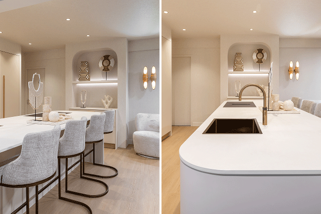Dankzij nieuwe technieken kunnen materialen als keramiek en natuursteen steeds vaker in gebogen vormen worden toegepast. ‘Dus geen scherpe hoeken meer. Alles krijgt zachte lijnen. Het resultaat is een keuken die niet alleen praktisch is, maar ook veel vriendelijker en uitnodigend aanvoelt.’