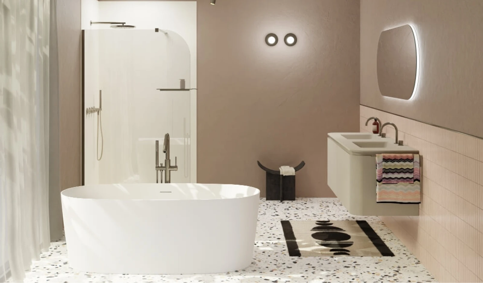 Er is maar één badkamer zoals die van jou. Nog een trend in 2025 is om je badkamer een persoonlijke twist te geven met behulp van opvallende details. Maak bijvoorbeeld van je douchekop een echte blikvanger door te kiezen voor een opvallende kleur als glanzend zwart of roségoud. Of ga voor een pronkstuk dat in het oog springt, zoals een marmeren waskom met opvallende ader, of een kleurrijke terrazzo douchebak. Genoeg mogelijkheden om jezelf te onderscheiden.