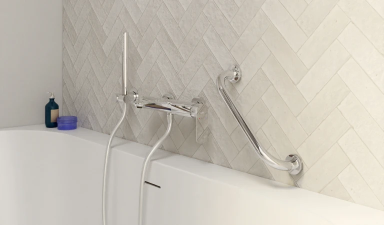 Voor extra grip is een badgreep fijn. Martijn: ‘Ook die heb je tegenwoordig in allerlei moderne kleuren, modellen en materialen, waardoor ze echt een mooie toevoeging zijn voor je badkamer.’