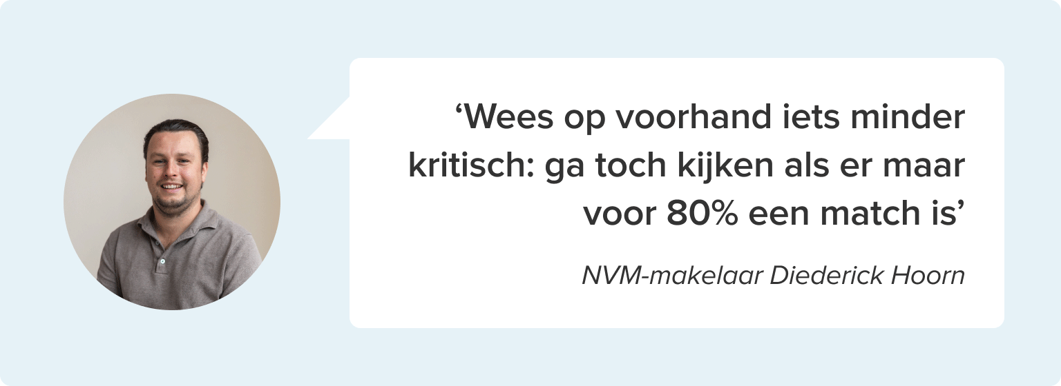 Dat is precies waar een makelaar voor is, geeft Diederick aan. ‘Als aankoopmakelaar ga ik bij alle bezichtigingen mee. Ik help kijken wat er te winnen valt met een andere indeling. Bovendien weet ik nu jullie wensen, waardoor ik actief huizen kan voorstellen. En als jullie straks jullie droomhuis vinden, help ik met de beste aanpak. Zodat je niet achter het net vist of juist veel te veel overbiedt.’