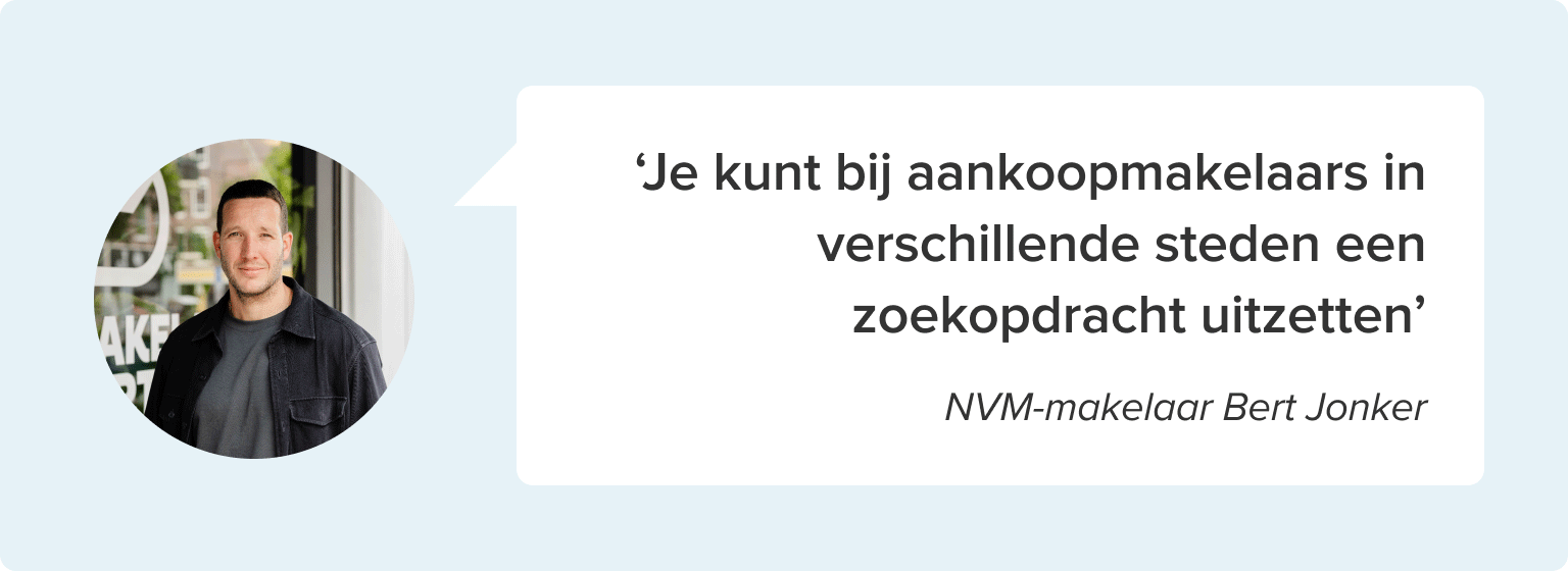 Het voordeel van een lokale aankoopmakelaar is dat die de verkoopmakelaars en de markt kent. ‘Zo'n makelaar zit dicht op het vuur en weet als eerste welke huizen in de verkoop gaan. Je kunt ook best bij aankoopmakelaars in verschillende steden een zoekopdracht uitzetten. Zelf heb ik ook klanten met meerdere profielen.’