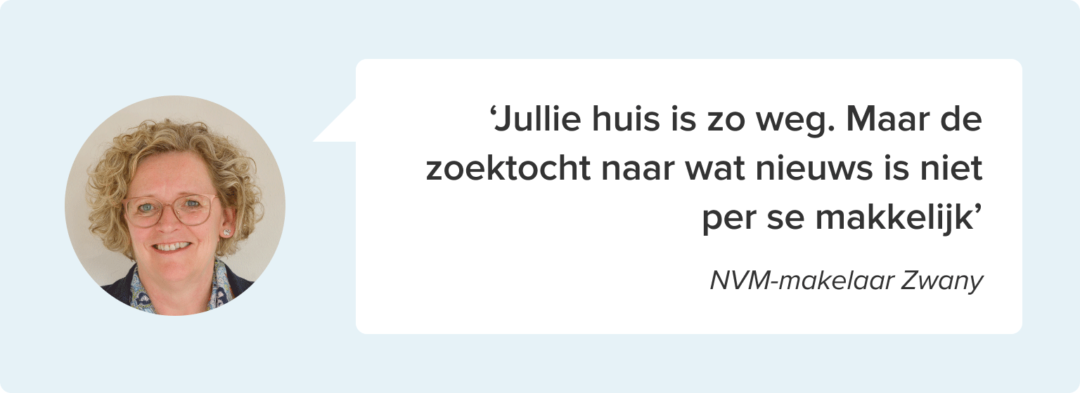 ‘Wat is er voor ons beschikbaar?’ wil Henk weten. ‘Tja,’ reageert Zwany, ‘het aanbod voor mensen van zestigplus is heel klein. Daarom zou ik in jullie situatie absoluut wachten met je huis verkopen tot je iets nieuws hebt gekocht. Anders krijg je echt stress om wat nieuws te vinden. Jullie huis is zo weg. Maar de zoektocht naar wat nieuws is niet per se makkelijk.’