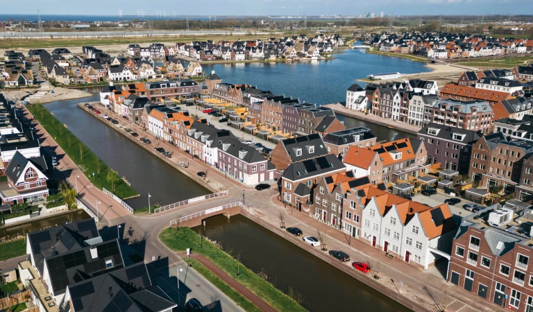 ‘We missen de reuring van ons oude buurtje wel een beetje. Gelukkig komen we voor ons werk nog regelmatig in de stad en onze dochter logeert nog vaak bij vriendinnen in Amsterdam. Het pluspunt aan de buurt is de groene omgeving. Hier wonen geeft een beetje een vakantiegevoel. We wonen aan een grachtje en het water komt uit op een plas. Ondanks dat het een nieuwbouwwijk is, heeft het al echt een dorpse sfeer.