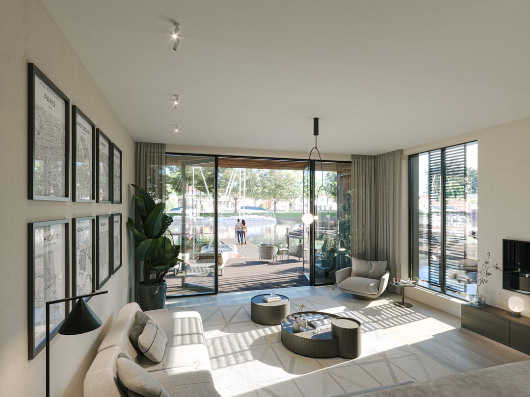 Binnen en buiten lopen hier moeiteloos in elkaar over. De living vormt het hart van de woning en ligt subtiel verdiept, wat een intieme sfeer creëert en tegelijkertijd een prachtig perspectief biedt op het water. Openslaande deuren verbinden de woonkamer met het terras en de privé steiger. Aan de andere zijde ligt de rustige tuin aan de werf, bereikbaar vanuit de keuken.