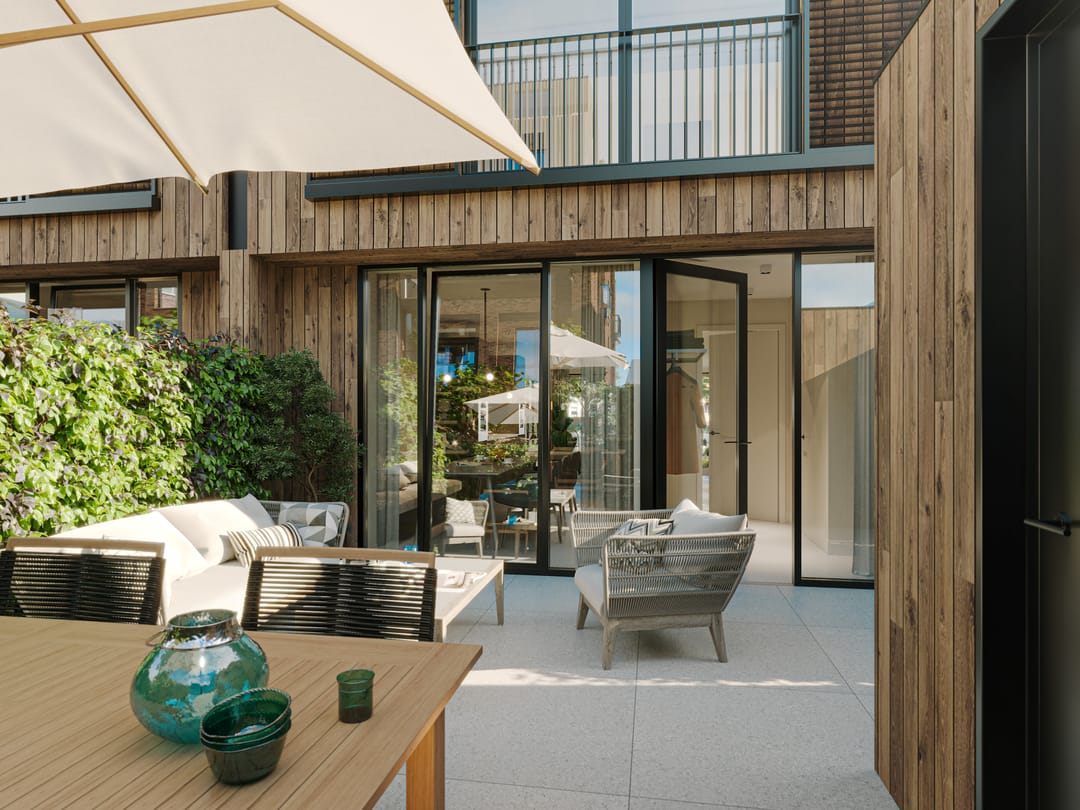 De vier watervilla’s Draak vormen het meest bijzondere onderdeel van De Werf bij de Sluis. Deze royale woningen liggen direct aan de Vecht en beschikken elk over een eigen aanlegsteiger. Hier stapt u vanuit de woonkamer zo het terras en het water op.