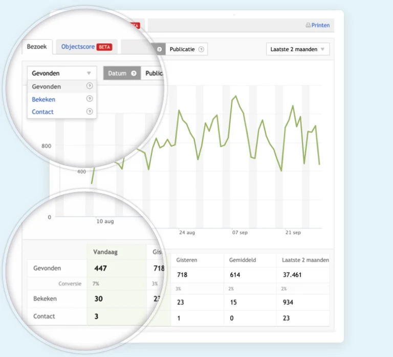 Als u uw object net op funda in business heeft geplaatst, ziet u waarschijnlijk een piek in het aantal keer dan uw object is bekeken. Dat geldt ook wanneer u een promotiemiddel inzet. De laatste stap in de funnel is contact. ‘Dit is voor u de belangrijkste stap,’ vertelt Blom. ‘Hier converteert de zoeker in een lead, een contactaanvraag voor de makelaar.’ Dit vindt u in de statistieken terug als conversie: het percentage zoekers dat uw object heeft bekeken en vervolgens contact met u heeft opgenomen. Aan de hand van de conversie kunt u vervolgens toetsen hoe uw object ervoor staat. Zo gebruikt u de statistieken om de prestaties uw objecten te verbeteren.