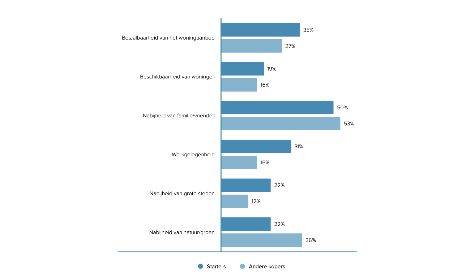 Waar de meeste respondenten het ook over eens zijn, is dat ze het liefst wonen in een rustige en ruimtelijke woonomgeving met voldoende natuur, al is deze wens wel sterker bij doorstromers. Ongeveer een derde van de starters zou ook wel in een stedelijke, kindvriendelijke of levendige omgeving willen wonen. Andere kopers vinden dit iets minder belangrijk.