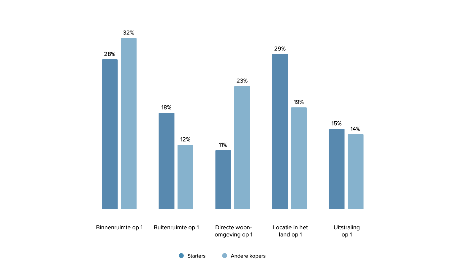 Kijken we naar welke aspecten van een huis ondervraagden het belangrijkst vinden, dan valt op dat starters locatie in het land (29%) ongeveer even vaak noemen als de binnenruimte (28%). Bij andere kopers komt locatie (19%) pas op de derde plek, na binnenruimte (32%) en directe woonomgeving, zoals de nabijheid van voorzieningen (23%).