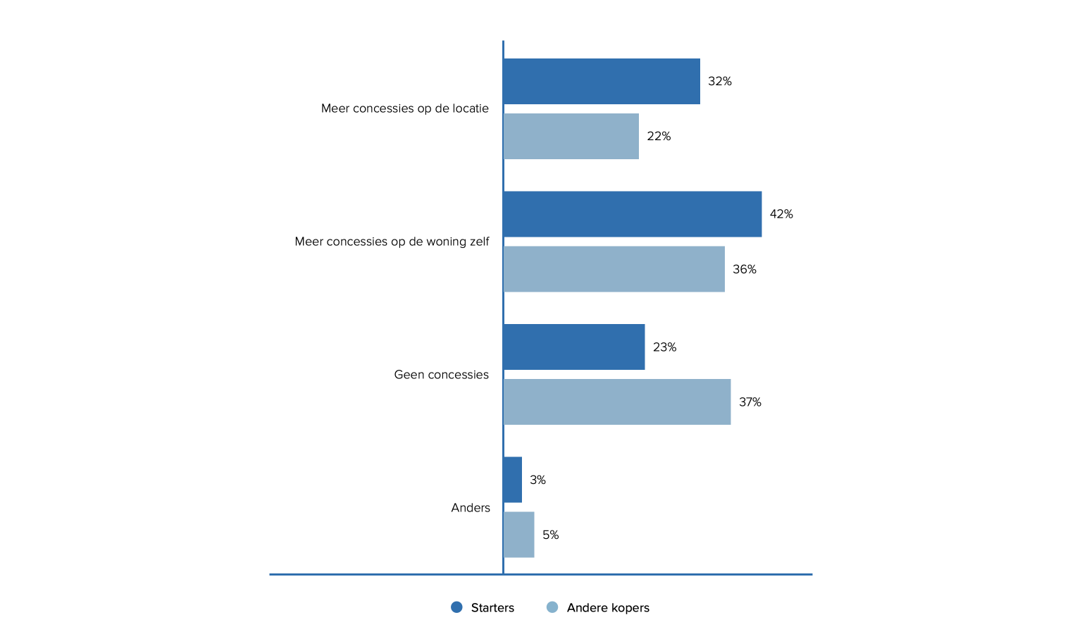Bij andere kopers staat de wens om gelijkvloers te wonen met stip bovenaan. Ook gezinsuitbreiding is een veelgenoemde reden, die door zowel starters als andere kopers ongeveer even vaak wordt genoemd.