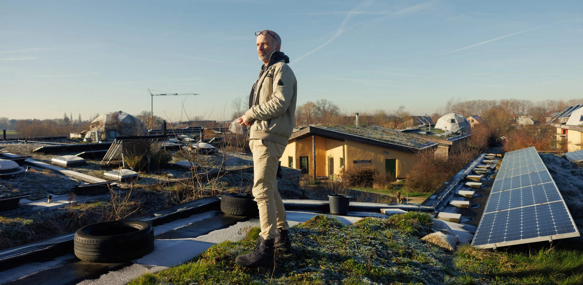 Met ’we’ bedoelt hij de ecologische wijk in het Overijsselse Olst, die bestaat uit 23 huizen en een gemeenschappelijk gebouw: het Middenhuis. Een gemeenschap van aardehuizen is uniek in Nederland en zelfs in Europa. Het heeft een extra voordeel, volgens Ferdi: ‘Je deelt de energie en voorzieningen en bent gezamenlijk verantwoordelijk voor onderhoud en beheer.’