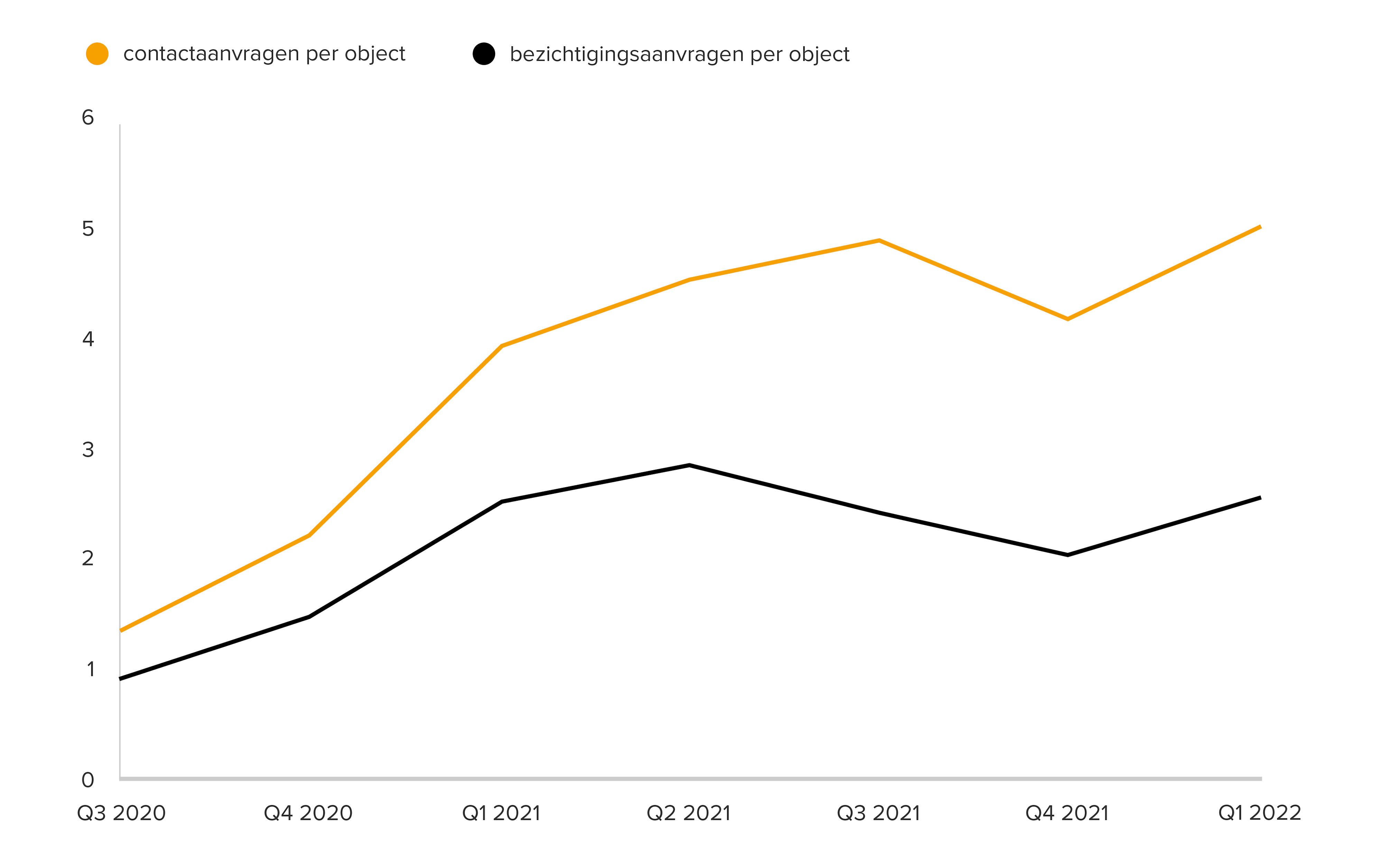 Waar eind 2021 de koop- en verkoopintentie dichter naar elkaar toe leken te groeien, lopen deze in het eerste kwartaal van 2022 weer iets verder uiteen. De koopintentie blijft nagenoeg gelijk aan die in het vorige kwartaal, terwijl de verkoopintentie licht daalt naar het niveau van Q3 2021. Ondertussen neemt de concurrentie onder kopers in het eerste kwartaal flink toe in vergelijking met eind 2021. Op funda steeg per beschikbare woning zowel het aantal contactaanvragen met makelaars (+25%), als het aantal bezichtigingsaanvragen (+31%).