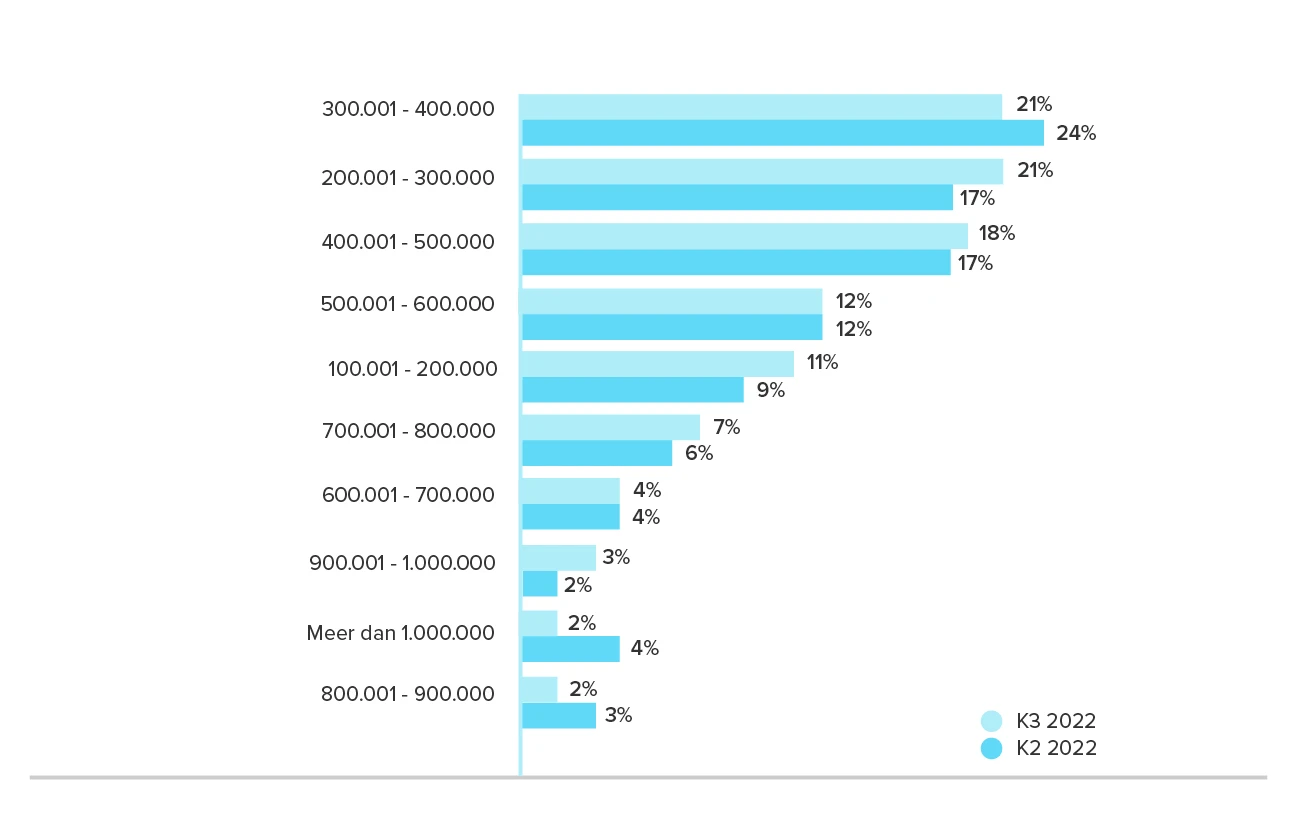 Woningen in de prijscategorieën tot € 500.000 waren altijd al het populairst op funda. Opvallend aan de cijfers over het derde kwartaal, is de verschuiving binnen deze categorie ten opzichte van het tweede kwartaal. Zo wordt de groep die aangeeft op zoek te zijn naar een woning tussen € 100.000 en € 300.000 groter, terwijl de groep die tussen € 300.000 en € 400.000 zegt te zoeken, kleiner wordt.