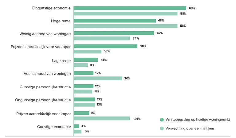 Waar een jaar geleden het sentiment op de woningmarkt werd gedomineerd door het geringe aanbod en de lage rente, zijn op dit moment de economische situatie en de hoge rente de belangrijkste factoren die het koop- en verkoopvertrouwen beïnvloeden.