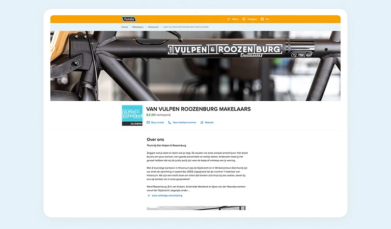 Nog niet zo lang geleden is de website aangepast. Roozenburg: ‘We hebben er bij het inrichten van onze profielpagina op funda op gelet dat deze consistent is met onze vernieuwde website.’ Vandaar dat in het headerbeeld het in Hilversum bekende logo van Van Vulpen Roozenburg een prominente plaats heeft. ‘Die opvallende huisstijl werkt heel goed voor ons.’