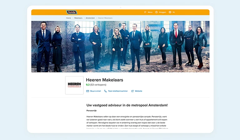 Eran Hausel van Heeren Makelaars: ‘Wij bevinden ons in een keiharde markt en wat we willen uitstralen in alles is: power! Zonder dat kom je er niet in een stad als Amsterdam. Dat willen we dus ook aan potentiële klanten laten zien: power in onderhandelingen, energie in alles wat we doen. Daarom hebben wij een krachtig headerbeeld. Verder hebben we onder de headerfoto geen kantoorvideo gezet, maar verkoopvideo’s. Omdat wij denken dat videovisits, zoals wij ze noemen, de toekomst hebben. We geven altijd een eigen draai aan het verhaal, met een geintje erin. Jezelf niet al te serieus nemen hoort bij onze stijl.’