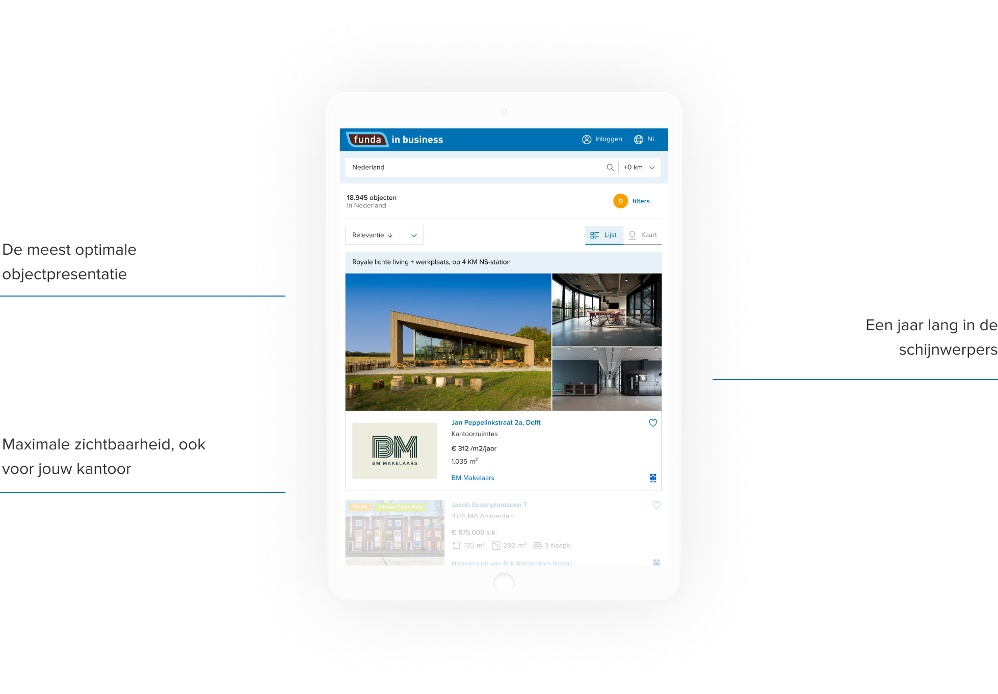 Geef jouw objecten de aandacht die ze verdienen. Met Funda Premium combineer je onze meest populaire producten in één: Funda Compleet en Blikvanger. Vanaf dag één is jouw object optimaal zichtbaar met 360˚ foto’s, een video én een plattegrond, maar ook meer en grotere foto’s en een uitgelichte unieke eigenschap. Daarnaast is ook nog je kantoor beter zichtbaar. Wat wil je nog meer?