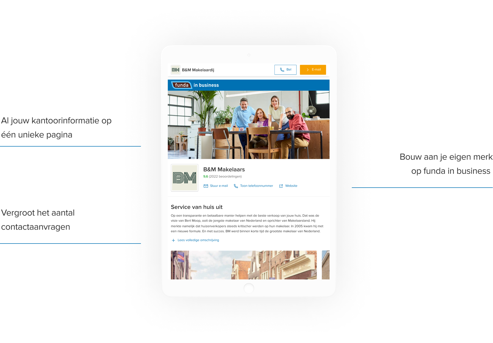 Het vernieuwde Kantoorprofiel Pro laat potentiële klanten optimaal kennis maken met jouw kantoor. Naast een unieke kantoorpagina ben je nu ook met jouw logo, foto en persoonlijke contactgegevens aanwezig op de meest bezochte pagina van Funda: de objectpagina's. Dit digitale visitekaartje biedt jou de gelegenheid het grote Funda in Business publiek te laten zien wat jou onderscheidt van de rest. Met een link naar je eigen website.