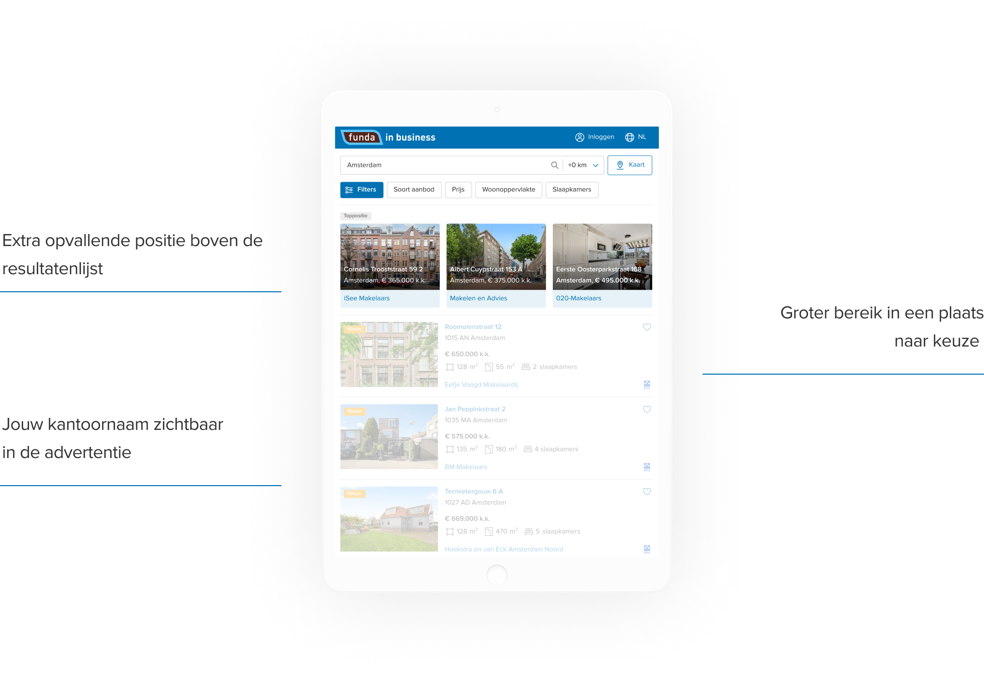 Heeft jouw object nét dat beetje extra aandacht nodig? Dan is Toppositie interessant. Je bepaalt zelf in welke plaats je het inzet, waardoor je een gerichter publiek bereikt. Daarnaast krijg je ook nog eens een kantoorvermelding.