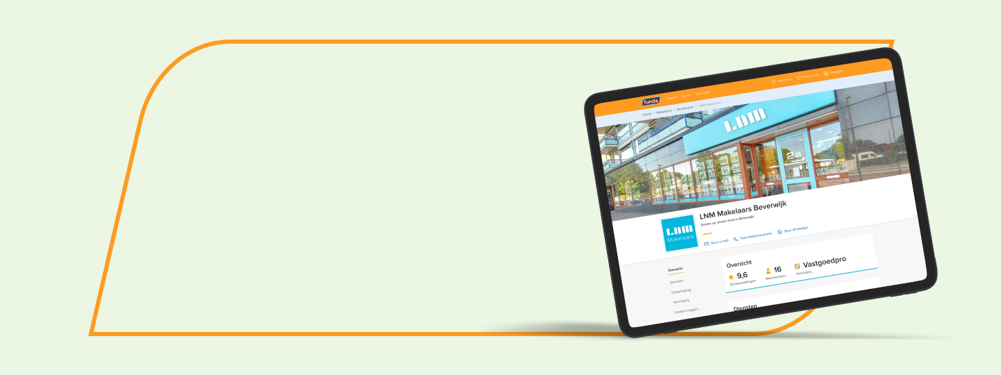 Het vernieuwde Kantoorprofiel Pro laat potentiële klanten optimaal kennis maken met jouw kantoor. Naast een unieke kantoorpagina ben je nu ook met jouw logo, foto en persoonlijke contactgegevens aanwezig op de meest bezochte pagina van Funda: de objectpagina's. Dit digitale uithangbord biedt jou de gelegenheid het grote Funda-publiek te laten zien wat jou onderscheidt van de rest. De ideale plek voor marketing dus, met een link naar jouw website.
