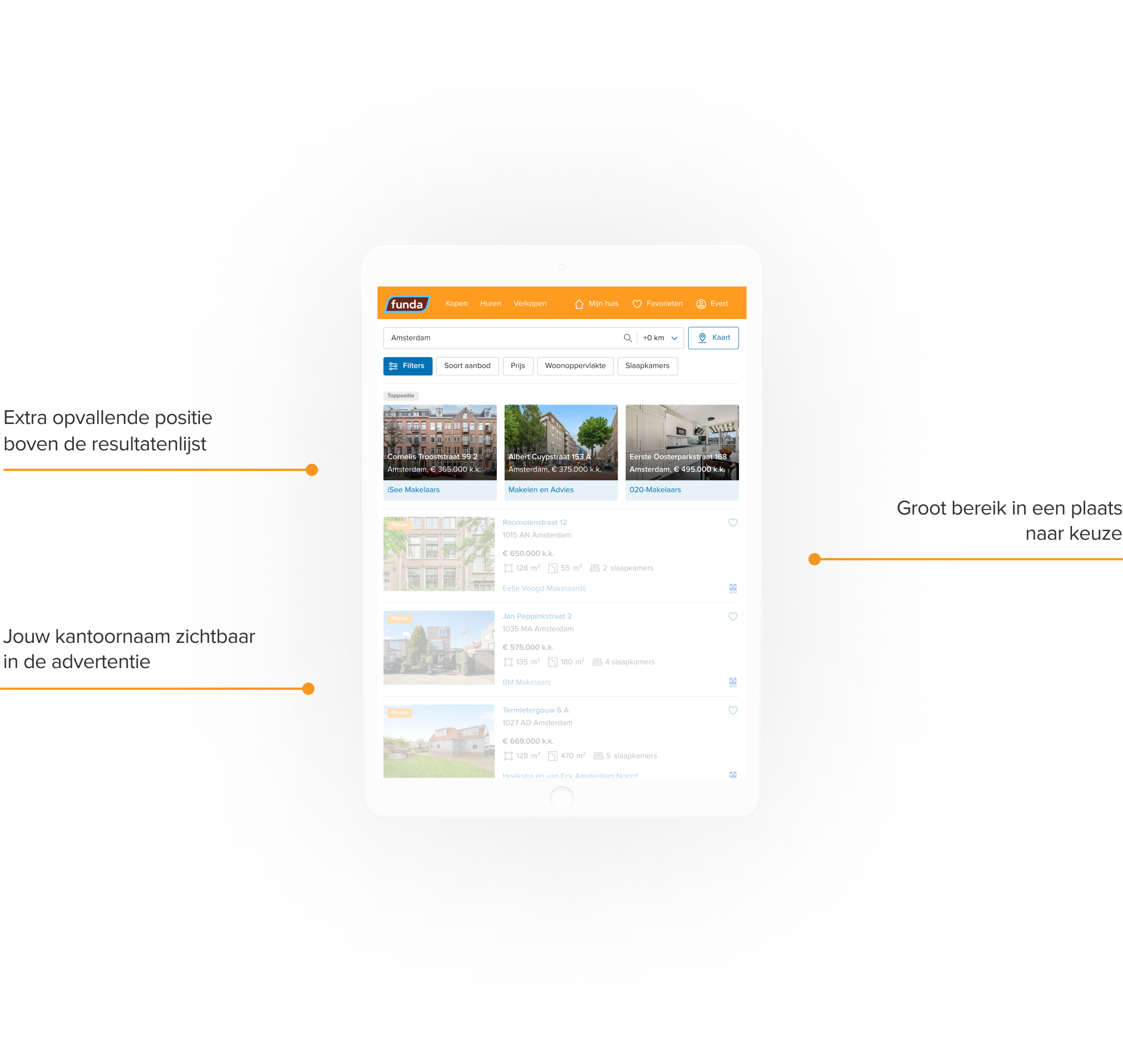 Soms heb je een object dat je nét dat beetje extra aandacht wil geven. Dan is Toppositie interessant. Hiermee komt jouw object boven de resultatenlijst te staan - en dat valt op. Bepaal zelf in welke plaats je Toppositie inzet en dus waar jouw object, inclusief kantoorvermelding, een groter publiek bereikt.